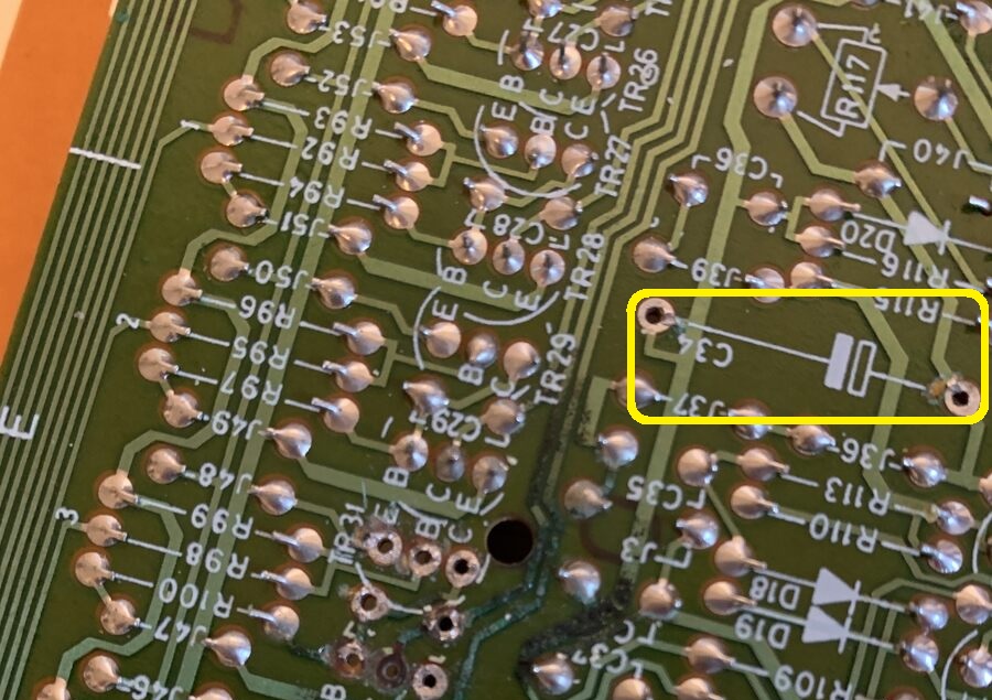 Der ist nicht ausgelaufen. Den habe ich nur entfernt, da ich nach 30 Jahren zur Sicherheit neue einsetzen will. Die merkwürdige Stelle war siehst Du am Transistor auf dem Bild, wo er noch eingelötet ist.
