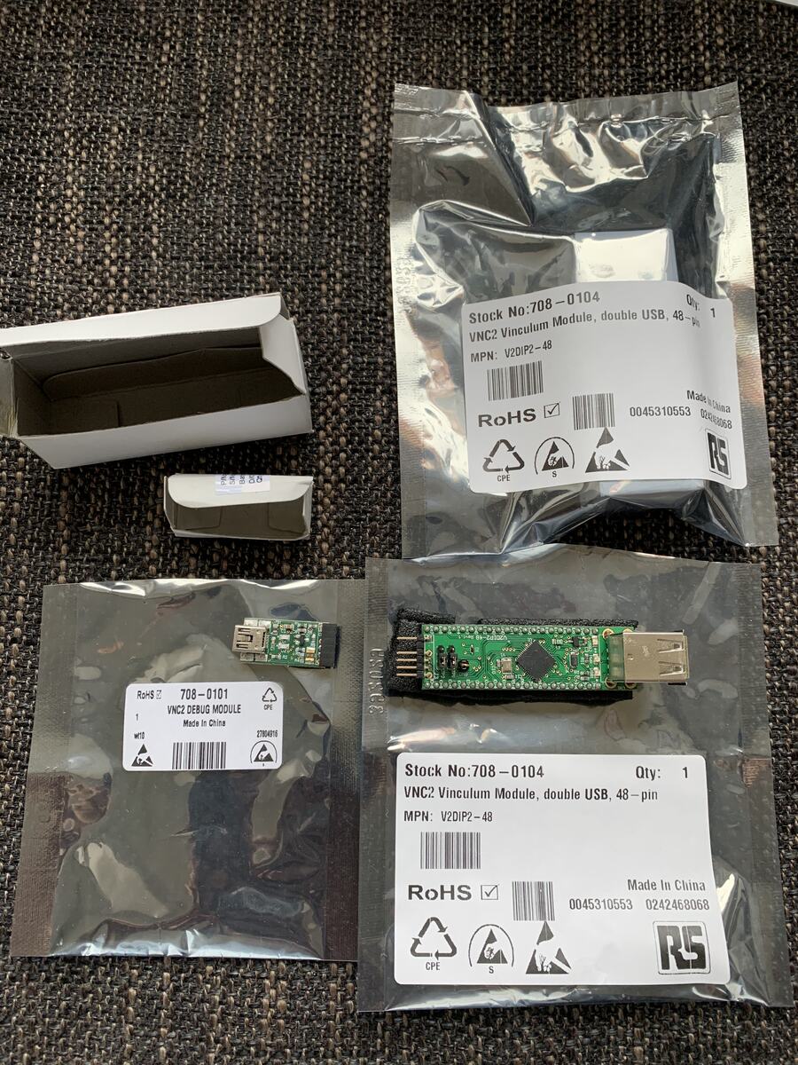 Hallo, ich habe ein Evaluation-Set für die USB-Host-Chips "Vinculum" von FTDI abzugeben. VHB: 30€ (alle 3 zusammen) 1.) 2 Stück: VNC2 Vinculum Module, double USB, 48-pin (Datenblatt unten) - einer ungeöffnet / originalverschweißt - einer geöffnet, ein paar Tage getestet und voll funktionsfähig - von RS-Components: 708-0104, Wert 2x30€ 2.) 1x VNC2 Debug Module - spezieller USB-Seriell-Wandler zum Aufstecken auf das obige Modul - wird zum Programmieren benötigt - geöffnet, ein paar Tage getestet und voll funktionsfähig - von RS-Components: 708-0101, Wert 18€ Mit diesen Chips kann man einfache USB-Geräte an (non-USB-)Mikrocontroller mittels serieller Leitung anschließen. Bei diesen Modulen kann man jeweils 2 Geräte anschließen. Es funktionieren Tastaturen, Mäuse, USB-Speichersticks (in Grenzen wg.kompatiblen Dateisystemen)) FTDI-USB-Seriell-Wandler, USB-Geräte die selber intern FTDI-Chips verwenden, ... http://www.ftdichip.com/Support/Documents/DataSheets/Modules/DS_V2DIP2-48.pdf http://www.ftdichip.com/Support/Documents/DataSheets/Modules/DS_V2Debug_Module.pdf cu joern