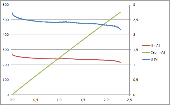 Hallo, ich habe über die Zeit jede Menge unterschiedlich alter Akkus angesammelt und dachte mir, es wäre doch schön zu wissen, was die noch taugen. Also habe ich mir einen kleinen Aufbau gebastelt, mit dem ich die zuvor vollgeladenen Akkus (in diesem Fall Mignon; AA) entlade und dabei Spannung/Strom über die Zeit messe. Der Aufbau besteht aus einem µC(Arduino), welcher ein Realis schaltet und die Spannung überwacht. Zugeschaltet wird ein 10 Ohm Lastwiderstand. Ich teste zwei Mignon-Zelle zurzeit (also ca. 2,4V). Und jetzt kommen meine Zweifel (Gedankenfehler?). Als Referenz habe ich zwei ganz neue/volle 3800mAh Mignons genommen. Die sind nach 2,3h weitgehend leer (schalte etwas zeitverzögert unter der Restspannung von 2,2V ab, siehe Grafik). Jetzt mal alle "Kleinigkeiten" vernachlässigt: I = 2,4V/10 Ohm = 240mA Akku-Kapazität = 240mA * 2,3h = 552mAh (das ist ja relativ weit weg von 3800mAh) Ist der Akku so falsch muss ich die Schuld bei mir suchen?