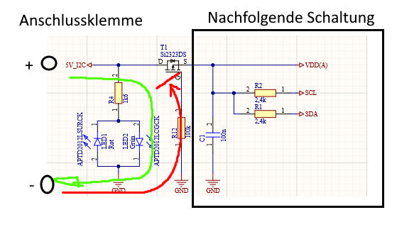 Hab das mal schnell simuliert. Wenn du die Schaltung nur über den I2C-Chip versorgst (also von rechts) und das verpolt ist, dann ist der FET ja sozusagen im Massepfad und die Body-Diode leitet... Bei richtigem Anschluss ist die GS-Spannung -5V und der FET leitet. Wie oben erwähnt, bin ich der Meinung, dieser Schutz funktioniert nur vor Verpolung "von links"... Oder sehe ich da was falsch?