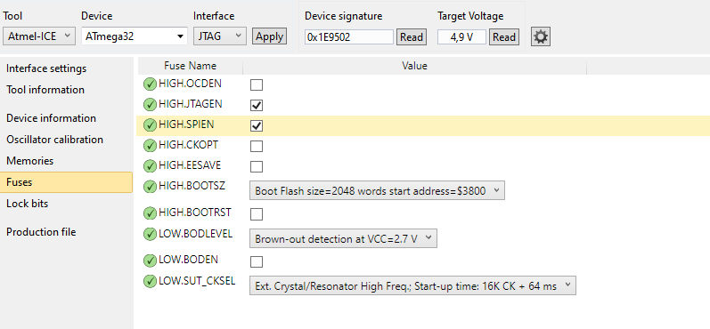 Hallo liebes Forum! Ich habe mal zwei Bilder angehängt. Im ersten Bild fuse_1.png habe ich HIGH.EESAVE gesetzt und übertragen. Soweit so gut ein Read bestätigt mir es ist gesetzt. Übertrage ich nun in Mikrochip Studio (ehemals AVR Studio 7), dass Programm erneut wird mir HIGH.EESAVE wieder zurückgesetzt wie im Bild fuse_2.png aber warum?? Zur Erklärung: Ich habe ein Programm, das mir über 1-Wire einen DS1820 den ROM-Code ausliest und danach ins EEPROM ablegen soll. Von dort hole ich nachfolgend ROM-Code aus dem EEPROM und um ein Sog. MATCH_ROM auszuführen, um diesen Sensor auszulesen. Leider ist es jetzt so, dass nichts in den EEPROM gespeichert wurde. Es hatte schon ohne Probleme funktioniert, aber jetzt bin ich am Rätseln. Vielleicht hängt es auch mit dem kürzlich Installierten MPLAB von Mikrochip zusammen. Ich hatte mir dann auch den Atmel ICE Full-Kit zugelegt. Ich habe mein Projekt dort importiert und mal getestet ob es auch in MPLAB funktioniert. Tat es auch, aber seit kurzem habe die o.g. Probleme. Nochmal zur Verdeutlichung der Rom-Code wird gelesen aber nicht im EEPROM gespeichert. Weiß jemand warum mir dieses HIGH.EESAVE immer wieder zurück gesetzt wird??