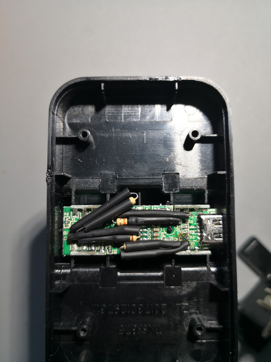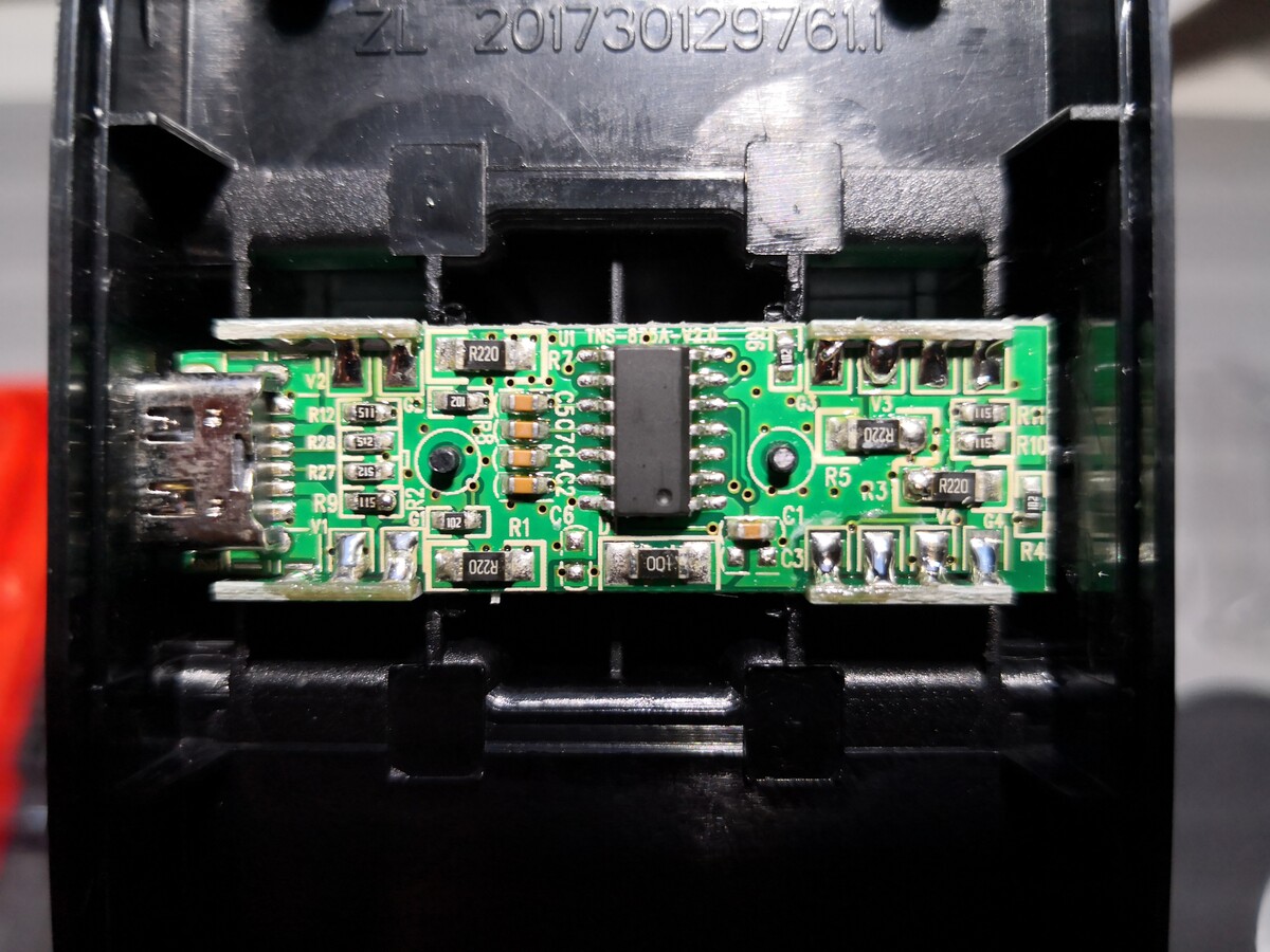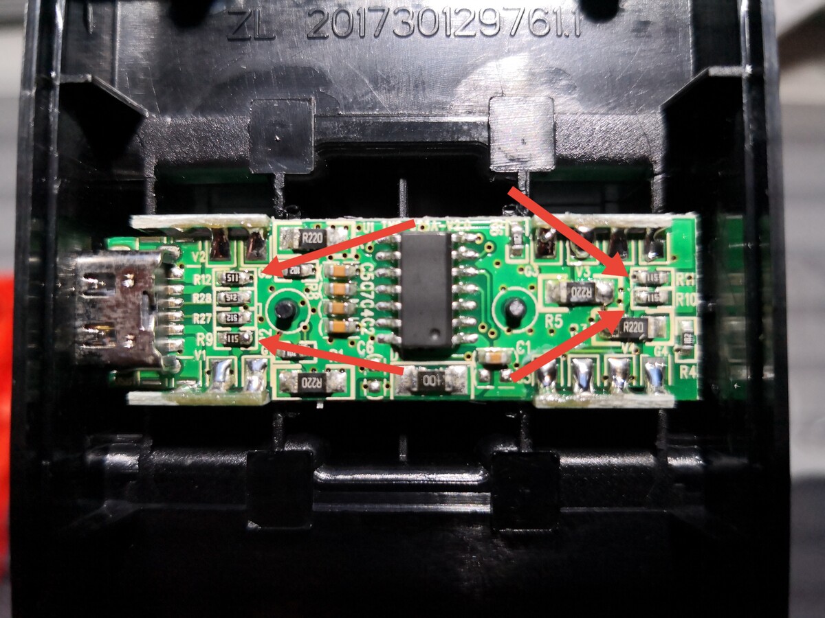 Hi, habe besagte Ladestation TNS 875A und eigentlich "nur" das Problem, dass die LEDs viel zu hell sind. Kraft meines gefährlichen Halbwissens hab ich nun das Teil geöffnet in der Hoffnung, LEDs mit Vorwiderständen zu finden. Jedoch ist die Seite mit den LEDs nicht sichtbar und auch wahrscheinlich verklebt. Da auf der sichtbaren Seite jede Menge Widerstände zu sehen sind habe ich weiterhin die Hoffnung die Vorwiderstände der LEDs zu finden und sie durch welche mit höhrem Wert zu ersetzen um die Helligkeit zu reduzieren. Ich gehe nicht davon aus, dass die per PWM angesteuert werden. Idee ist nun, mit einem Multimeter in Diodenprüfstellung oder dem Komponententester meines Analogoszis die LEDs "auszuklingeln". Vielleicht sogar sichtbar, da die meisten LEDs, die ich so bisher getestet habe, auch etwas aufleuchten. Frage(n): Könnte ich etwas zerstören, wenn ich das in circuit mache? Hat jemand eine bessere Idee? Hat das jemand vielleicht schon gelöst und ich war zu doof das zu finden? Ausreichend Platz und Fingerfertigkeit vorausgesetzt, könnte ich die SMD Teile "einfach" durch 1/4W THT Widerstände ersetzen? Habe ein Bild angehängt... Hoffe es erscheint auch.