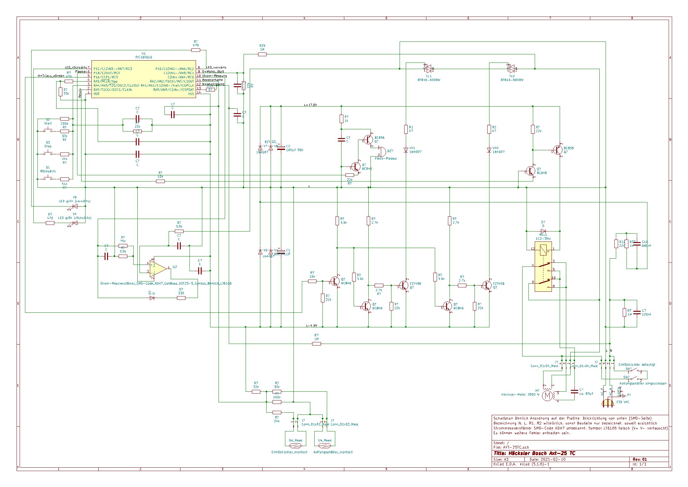 Hallo allerseits, gelesen hab ich schon oft hier - heute mein erster Beitrag. Auch diesmal bin ich mit meiner Frage hier gelandet - im Nachbarthread "Triacs in Reihe". Ich beginne trotzdem ein eigenes Thema. Gleich vorweg meine Frage: Kann sich jemand einen Reim darauf machen, warum hier tatsächlich zwei Triacs in Reihe geschaltet sind? Ich kann mir schon nicht genau vorstellen, was in einem Triac vorgeht, wodurch "2 Thyristoren" mit einem Gate (gegenüber einem Bezugspunkt A1) gezündet werden können - noch dazu mit positivem oder negativem Gatestrom. Noch undurchsichtiger ist es für mich bei zwei Triacs in Reihe. Dass das im Nachbarthread eher für abwegig gehalten wurde, verstehe ich. Bei meinem Gerät ist das aber so gemacht und es hat jahrelang bestens funktioniert. Es ist ein Häcksler Bosch Axt-25 TC mit einem kräftigen Kondensatormotor + Getriebe und langsam laufender Schneid-"Turbine". Er braucht im Leerlauf ca. 600W, unter Last ca. 1200-1500W. Wenn er wegen einem harten Ast mal blockiert, sind es vermutlich mehr als die 2,5 kW Nennleistung. Dann wird er nach geschätzt einer halben Sekunde abgeschaltet. Neben dem normalen Ein/Aus ist das vermutlich eine Herausforderung für das Schaltelement - hier die beiden Triacs. Immerhin kommt ihnen zugute, dass sie ja etwa im Strom-Nulldurchgang abschalten - wenn die Induktivität des Motors nicht mehr viel Energie enthält. Ein Defekt entstand kurioserweise nicht unter Last. Ich hatte ein einige Meter langes Verlängerungskabel eingesteckt - nicht zuletzt am Häcksler, sondern am anderen Ende in die Kabeltrommel. In dem Moment hörte ich ein kuzens unscheinbares Geräusch und mir schwante schon Übles. Tatsächlich ging nur noch die LED an, aber nicht der Motor. Auf der Steuerplatine war der 47-Ohm SMD-Widerstand R2 vor dem Gate des Triacs Tc2 durchgebrannt. Ob mehr Schaden genommen hatte? Die Bauteile drum herum schienen OK. Auch die Triacs hab ich mit Kleinspannung (12V- mit Vorwiderstand) getestet und konnte sie in beiden Richtungen zünden. Nach Ersetzen von R2 lief der Motor wieder ... aber bald (nach dem Zusammenbau des Gerätes) nicht mehr. Also hab ich den Schaltplan gezeichnet, um die Funktion zu verstehen. Es gibt zwei Gleichspannungen, beide auf den Pol der Netzspannung bezogen, den ich als "L" bezeichnet hab. Die +17,6V sind nur für das Relais für die vorwärts/rückwärts-Umschaltung und für den Fehler-Piepston. Der Rest wird mit knapp -5V (gemessen -4,89) versorgt: der Controller, die Zündung der Triacs und die wichtige Strom-Messung mittels Spannungsabfall an einem Leiterbahnstück. (Bei letzterer konnte ich den SMD-Aufdruck "ADH7" des Messverstärkers keinem Bauteil-Typ zuordnen - und hab ersatzhalber genommen, was ich in der Bibliothek von Kicad mit SOT23-5-Gehäuse fand. Zumindest die Polarität der Versorgungsspannung passt bei dem Symbol nicht - aber um die Strommessung geht es mir hier ja nicht.) Die Ansteuerung der beiden Triacs erfolgt nicht irgendwie unabhängig voneinander, sondern von einem Anschluss des Mikrocontrollers ausgehend (sicherlich über kurze Impulse ab Nulldurchgang der Netzspannung), über fünf Transistoren - der erste noch gemeinsam und dann je zwei für jeden Triac. Der letzte, ist je ein FZT458 (400V 0,3A), gefolgt von einer Diode 1N4007 und dem genannten 47-Ohm-Widerstand. Die "Endstufen" zur Ansteuerug der Triacs sind also gleich aufgebaut - obwohl sie das nicht müssten. Der linke Tc1 liegt mit seiner Elektrode A1 an "L", worauf auch die -5V für seine Zündung bezogen sind. Dieser Ansteuerzweig muss also keine hohen Spannungen sperren. Beim zweiten Triac Tc2 ist dagegen das Potential von A1 (und damit des Gate) im gesperrten Zustand unklar und im teilweise leitenden eher gefährlich. Da hat der "Hochspannungs"-Transistor seine Berechtigung und in der anderen Richtung sperrt die Diode 1N4007. Es ist wohl auch kein Zufall, dass R2 durchgebrannt ist (und nicht R1 bei Tc1). Dass der Motor zum 2. mal nicht mehr lief, lag offenbar daran, dass Tc2 nicht mehr gezündet wurde (hatte der doch einen Knacks oder sein Ansteuertransistor?). Als ich Tc2 mit einer 60W Glühbirne überbrückt habe, brannte die, wenn sonst der Motor laufen sollte. Etwas unüberlegt habe ich dann Tc2 direkt überbrückt, aufdass der Motor laufe. Es brannte der ersetzte R2 durch - diesmal mit Lichtbogen - und die letzten zwei Transistoren und der 2,7k-Widerstand dazwischen auch gleich (mindestens). Da hätte ich z.B. R2 vorher entfernen sollen. Das könnte ich immer noch und Tc2 überbrücken. Dann wüsste ich wieder mehr ... Vielleicht würde das Gerät dann wieder funktionieren - aber selbst wenn, wie lange? Da bin ich wieder bei der Frage, warum hier 2 Triacs in Reihe sind (trotz des damit verbundenen Aufwandes und Risikos)? Soll es die Spannungsfestigkeit erhöhen? Hätte dann nicht ein Triac der 800V-Version gereicht? Hätte der interne "Snubber" eines solchen snubberless Triacs nicht gereicht - die von zweien in Reihe aber schon? Wäre dann nicht 1 Triac + externer Snubber einfacher gewesen? War es eine Schnapsidee des Entwicklers, also eigentlich unnötig bzw. ein Fehler? Oder hat es mit einem nicht funktioniert und es gibt doch einen guten Grund? Silizium-Halbleiter sehe ich eigentlich als abnützungsfrei an (jedenfalls bei Kleinsignal). Ist es bei Leistungshalbleitern anders (man könnte meinen, darin "blitzt" es ja kräftig)? Was mögen die snubberless Triacs als internen Snubber enthalten - einen Varistor? Wie lange halten Varistoren - ist da nicht das Bild des Blitzens im Inneren etwas passender (ähnlich einer Funkenstrecke)? Das Gerät ist jetzt 10 Jahre alt und hat mir sehr gute Dienste geleistet. Ich häcksle sehr viel. Da könnte ich eine andere Steuerplatine kaufen (von 75 € repariert bis 120 € neu) - oder ich könnte alle defekten Bauteile ersetzen und die Triacs erneuern. Mich interessiert aber, warum es zu dem Fehler kam und ob man das nicht noch besser machen könnte. Es ist viel geworden, abe