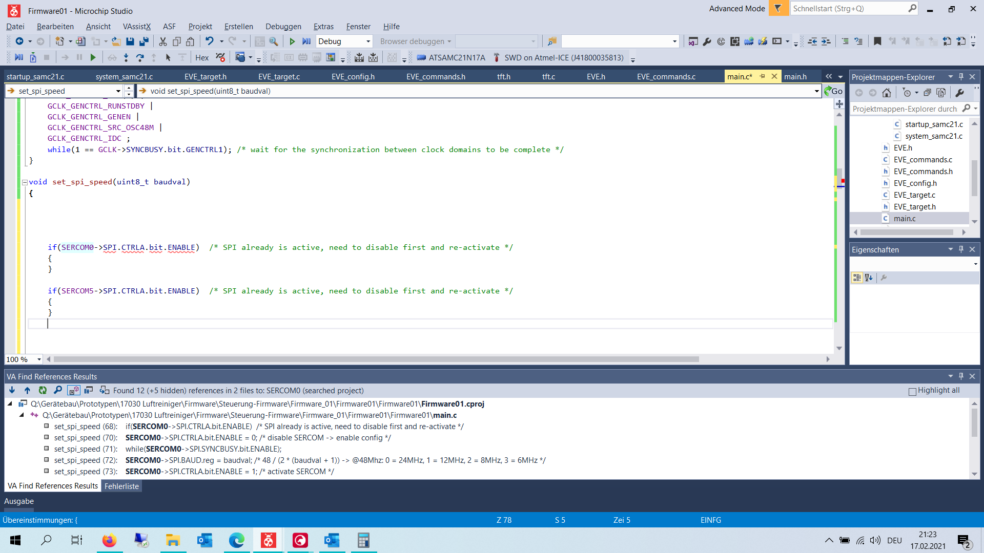 Hallo, ich habe das Phänomen, dass sich in einem neu erstellten Projekt für den SAMC21N17A SERCOM0 einfach nicht erreichen lässt. Im Screenshot habe ich eine einfache Abfrage eimal für SERCOM0 und einmal für SERCOM5 erstellt. SERCOM5 macht keinerlei Probleme. SERCOM0 ist nicht ansprechbar. Es gibt weder Vorschläge für die Unterbereiche wie SPI, etc. noch sonst irgendetwas. Zudem wird es rot unterstrichen. Weiß jemand, was ich vermisse oder falsch mache? Besten Dank!
