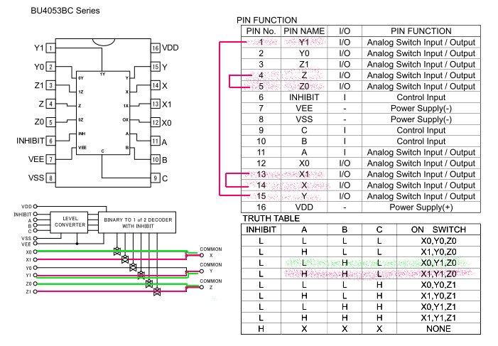 Hallo Allseits ! Ich verstehe den Verbindungsweg beim BU4053bc nicht. das Datenblatt: https://www.alldatasheet.com/datasheet-pdf/pdf/339183/ROHM/BU4053BCF.html Auf meinem Bild das rot eingezeichnete: wenn A:H B:H C:L (roter Pfad) dann sind verbunden: X1-X Y1-Y Z0-Z hoffe das stimmt so ! Wenn aber grün eingezeichnet: wohin geht dann X1 ?? gar nicht verbunden ?! denn X0 - X . Hab ich das so richtig verstanden ??? Danke für eure Hilfe ! LG, dentrixius