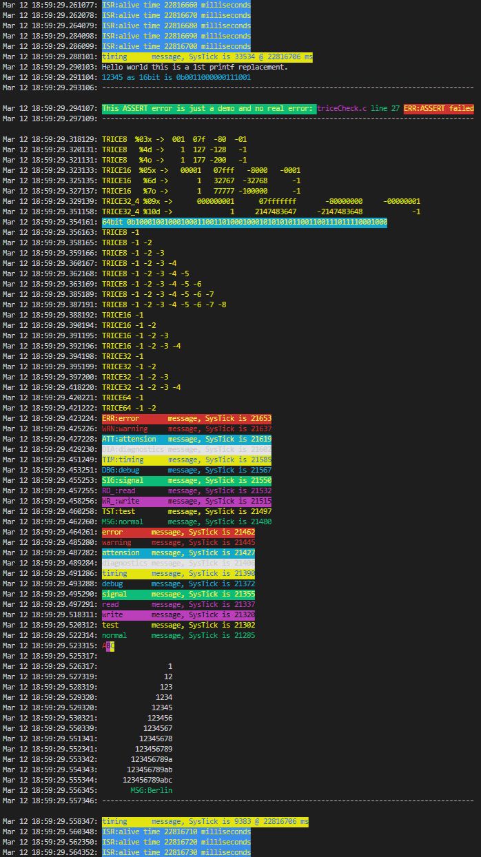 Wenn Log-Ausgaben mit printf oder einfach puts nicht oder schwer möglich sind, etwa im Interrupt oder Scheduler, instrumentiere den Code mit **TRICE**. Dadurch sinkt der Gesamt-Flashspeicherbedarf da nur etwa 150 Bytes Code hinzukommen, aber man erhält dafür den ganzen Platz den bisher die Logstrings und der printf Library Code benötigten. Man kann damit auch wunderbar Zeitmessungen machen, da ein TRICE sehr schnell geht. Siehe https://github.com/rokath/trice Die maschinell in Deutsch übersetzte Version: https://translate.google.com/translate?sl=en&tl=de&u=https://github.com/rokath/trice Nicht von der Doku abschrecken lassen, es sollte ganz ganz einfach zu benutzen sein für alle Arten von Prozessoren. Gerne hätte ich dazu Feedback und wenn jemand eine Portierung beisteuern möchte, wäre das toll.