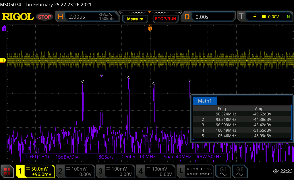 A. G. schrieb: > Ich habe schon alles mögliche in der Nähe abgeschaltet. Vielleicht musst du auch im weiteren Umfeld suchen. Bei mir kenne ich die Quelle, die kann ich in etwa 4 km Entfernung im dunkeln rot leuchten und blinken sehen - Abschalten unmöglich. Das Spektrum habe ich mit einem Rigol MSO5074 (70MHz) und einem kurzgeschlossenem BNC auf Krokoklemmen Kabel erstellt, mit einem Tastkopf ist der Empfang etwas schlechter.