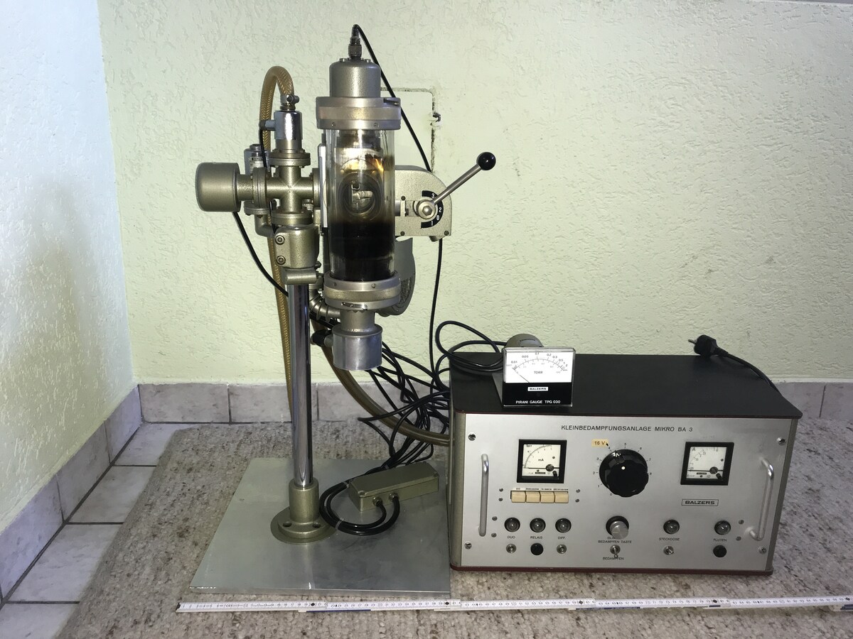 Verkaufe KLEINBEDAMPFUNGSANLAGE MIKRO BA 3 Ich denke das Gerät funktioniert nach dem PVD Verfahren und arbeitet mit Hochspannung. Das Gerät stammt aus eine Betriebsauflösung und war zuletzt 2020 in Betrieb. Wegen Zeitmangel zu verkaufen. Mit diesem Gerät kann man ein Hochvakuum erzeugen (es ist eine Turbo-Molekularpumpe verbaut). Wer sich ein bisschen auskennt und Mut zum Basteln mitbringt könnte damit z.B. folgendes machen: - Beschichtung von Spiegel (Teleskop, Astronomie, Brille) (Beispiel: https://youtu.be/EMzRZ4gXQ-0) - Bau eines Fusors (Beispiel: https://youtu.be/enId-kWrdz4) - Generelle Beschichtungen, Sputter, Beschichten von Bohrer, Schneidwerkzeug, etc. etc.