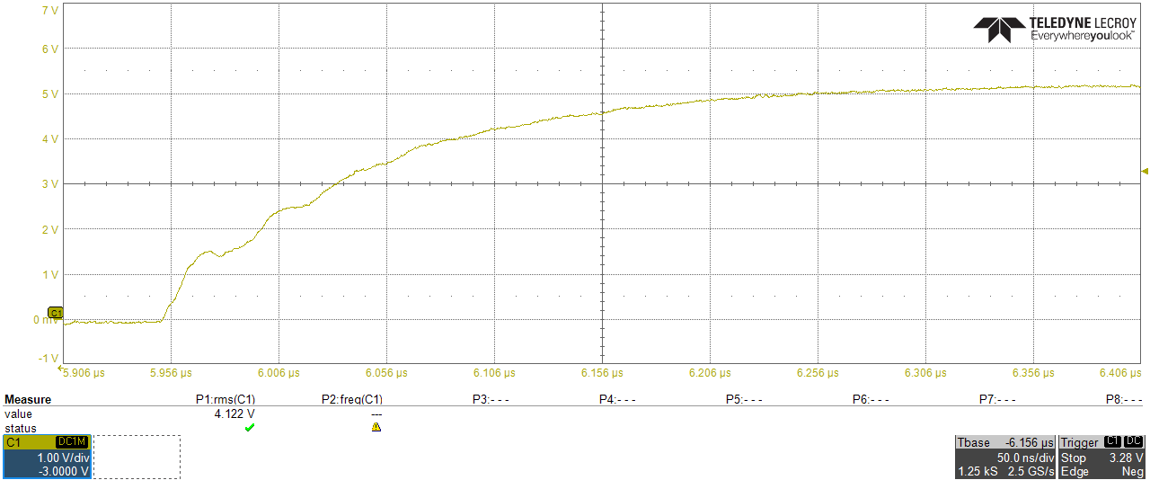 jo mei schrieb: > Das spezifiert das Datenblatt des Bausteins den du steuern willst. Ich habe im Datenblatt keine Angaben zur Flankensteilheit gefunden. Falk B. schrieb: > Was sagt dein Datenblatt des ADC? Hysteresis LOGIC INPUTS (IOVDD ≥ 2.7 V) min 0.08V max 0.25V Relative Angabe, und dazu noch ziemlich kleine Werte. Quasi gar kein Schmitt-Trigger. Klingt nach ==> jo mei schrieb: > Ich > betrachte das nicht-stetige Ansteigen oder Abfallen der Flanke > als das Problem. jo mei schrieb: > Will heissen dass mehrfache Impedanz-Sprünge auf dem Gesamtverlauf > der Leitung ein ganz komplexes Klingelverhalten produzieren kann. Das befürchte ich auch, habe aber keine Ahnung wie man das beseitigt. Ich meine, die Schleifringe haben Koax-Kabel, wahrscheinlich 50 Ohm. Flachbandkabel hat 120-130 Ohm. Wenn ich jetzt alle Leitungen auf Koax wechsle, dann sieht der Aufbau aus wie Spaghetti. Ich habe das mal simuliert, siehe Anhang(Abgegriffen am R2). Sieht halbwegs ähnlich aus zu https://www.mikrocontroller.net/attachment/497314/CLK_rise.png jo mei schrieb: > Schmitt Trigger > machen aber nicht allgemein glücklich. Wie löst man aber im Allgemeinen so ein Problem? Wenn also die Leitungsführung mehrere Strecken mit unterschiedlichen Wellenwiderständen aufweist? Es kommt zu Mehrfachreflexionen und damit zu solch unschönen Signalverläufen. Ist das die Lösung? ==> Falk B. schrieb: > Das MINIMUM ist ein RC-Filter am SCK-Eingang des ADC + > Schmitt-Trigger, damit die Störpulse definitiv nicht dort rein > kommen.
