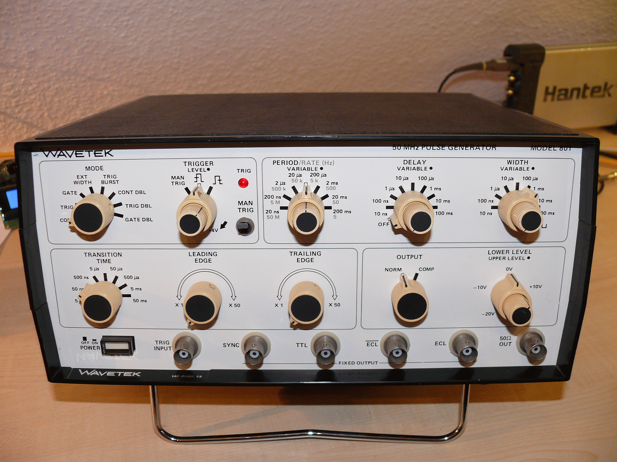 Hallo, verkaufe Wavetek 801 Pulse Generator, max. 50 MHz. Gerät ist in einwandfreiem Zustand, ausgedrucktes Handbuch 26 S. ist dabei. - einstellbare Pulsfrequenz, Duty cycle, Anstiegs- und Abfallzeit. - min. Anstiegs- / Abfallszeit 7ns, typ. 5ns. - verschiedene Outputs, variable +/-20Vpp, TTL, ECL, Inversschalter - Pulsfrequenz 5 Hz bis 50 MHz - Trigger, Gate, Burst, separater Sync-Eingang, manueller Trigger Preis EUR 75,- bei Abholung PLZ-Bereich 36, ansonsten zzgl. P&P. Gruß... Bert