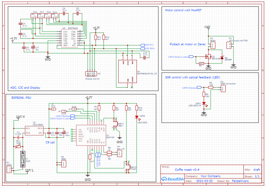 Hallo zusammen, ich hab für mich ein Projekt ausgesucht, für das ich meine erste Platine erstellt habe und würde mich daher um eure Hilfe und prüfende Blicke freuen. Ziel ist es mit der Platine einen Kafferöster zu steuern. Das Projekt umfasst ein ESP8266, der über zwei ICs vier Thermoelement auslesen kann inkl. Kaltstellenkompensation per Software. Weiter kann ein SSR angesteuert werden, für einen Heizdraht mit 1,1 kW. Weiter ist ein PWM gesteuerter MOSFET vorgesehen, um 24V eines externen Netzteils für einen DC Motor zu schalten. Zukünftige Erweiterungen durch die beiden IO Ports, GND sowie die OLED Anbindung per I2C. Den MOSFET Bereich habe ich versucht zu separieren, um den Einfluss auf den uC und ICs zu minimieren. Für den Motor-DC Kreis ist entweder eine Flyback Diode oder eine Zener Diode vorgesehen (siehe Schaltplan "Motor control"). Weiter sind die Cs bei den TC optional, wie auch der C9. Anbei sind Schaltplan und PCB Layout. Über euer Feedback würde ich mich, wie gesagt, sehr freuen, um Fehler bei der ersten Platine zu vermeiden. Liebe Grüße