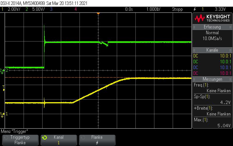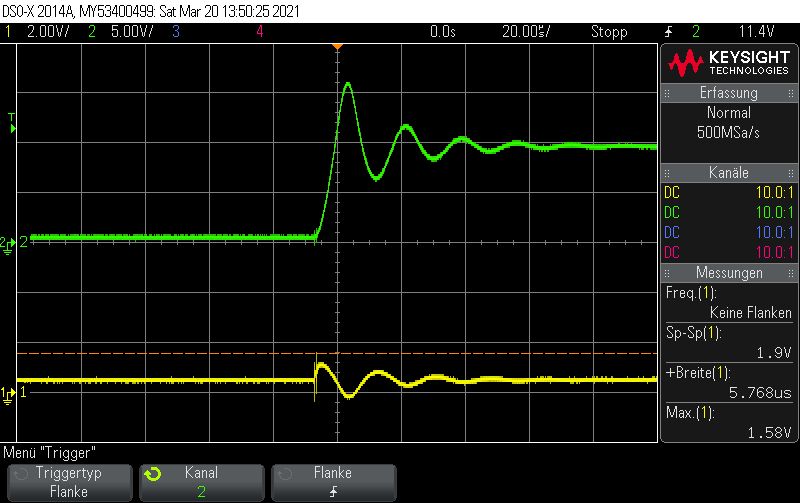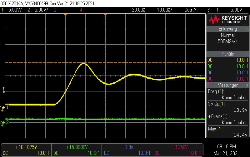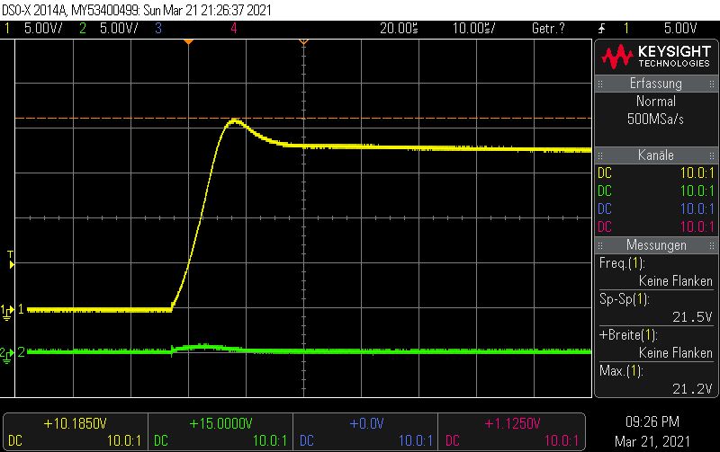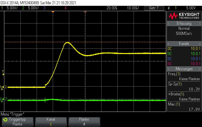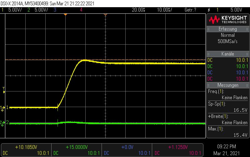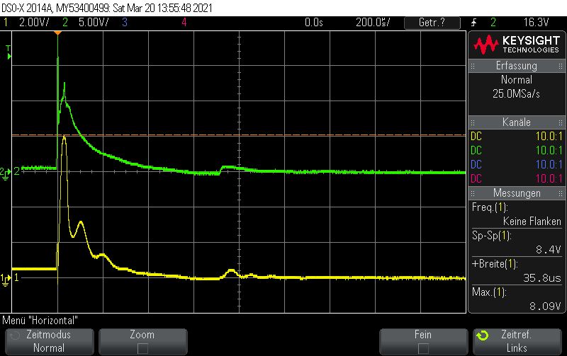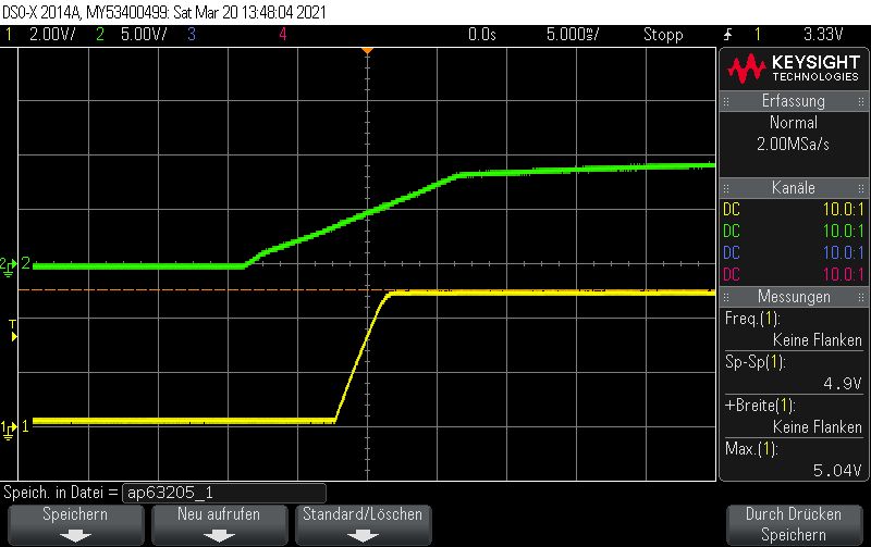 Hallo Die Eingangskondensatoren sind folgende: 10uF/50V X7R https://www.digikey.ch/product-detail/de/samsung-electro-mechanics/CL31B106KBHNNNE/1276-6767-1-ND/5961626 Ausgangskondensatoren: 22uF 10V X7R https://www.digikey.ch/product-detail/de/samsung-electro-mechanics/CL31B226MPHNNNE/1276-3148-1-ND/3891234 Die Induktivität: 4.7UH 2.6A 35 mOHM (Wahrscheinlich masslos überdimensioniert) https://www.digikey.ch/product-detail/de/taiyo-yuden/NRS5030T4R7MMGJ/587-3461-1-ND/4157801 Leider habe ich im Schema mit Bauteilen aus der Standardbibliothek gearbeitet, es nutzt also nichts wenn ich Details einblende, die ohnehin nicht stimmen. Mit dem Oszi habe ich mich mal ganz vorsichtig herangetastet. Generell: Kanal2, Grün: Eingangsspannung Dc-Dc Wandler Kanal1, Gelb: Ausgangsspannung Dc-Dc Wandler Vorab Bild: ap63205_5 Es Zeigt den "Einschaltmoment" wenn der Stecker die Buchse des Netzgeräts (DPS5005) berührt. Ich denke nicht, dass dies von Bedeutung ist, aber ich kann mich ja irren, deshalb ist er hier einmal vergrössert dargestellt. Bild: ap63205_6 Die Eingangsspannung ist auf 10V gestellt, alles funktioniert soweit. Eigenartig ist, dass die Speisung kurz vor dem ende der Rampe einbricht. Strombegrenzung ist auf 300mA. Dieses Phänomen habe ich zweimal registriert, bei zahlreichen weiteren Messungen wurde es nicht beobachtet. Bild: ap63205_8 Einschaltprozedur bei 15V Vin. Bild: ap63205_12 Da hatte sich wohl der Grosse Augenblick abgespielt, ehe ich die Möglichkeit hatte, die Spannungsskala anzupassen. Ich weiss, dass man jetzt darauf schwören kann, dass durch das prellen wie im ersten Bild hervorgehoben eine zu hohe Spannung entsteht. Ich möchte aber einwenden, dass der AP63205 auch stirbt, wenn ich das Netzteil (DPS5005) per Software einschalte. (Ich meine hiermit, der Stecker ist eingesteckt und ich drücke den "Ausgang einschalten"-Knopf. In diesem fall steigt die Spannung vom Netzteil in Form einer Rampe, wie es auf Bild ap63205_1 zu sehen ist. Leider habe ich den Screenshot bei 10V gemacht, aber bei 25V dürfte es ähnlich aussehen. Ich möchte die Messung jetzt nicht verifizieren, da ich nur noch 1IC übrig habe....