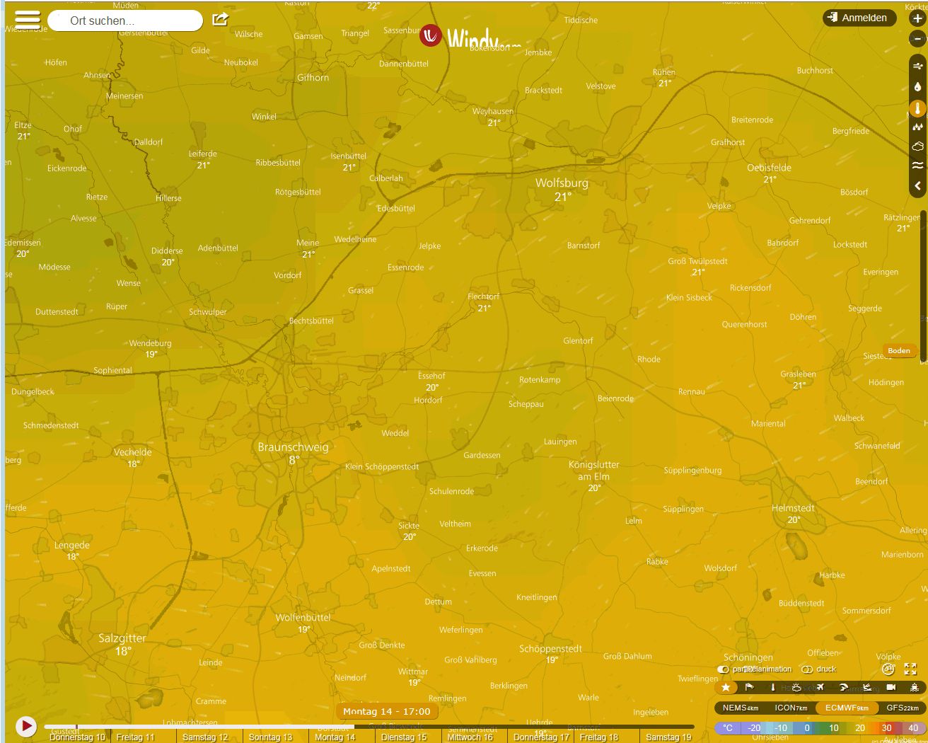 Der hier war auch witzig. Nicht die Vorhersage, sondern die angeblich aktuellen Werte. Braunschweig 8 der Rest drumrum um 20, das hätte Stürme gegeben.