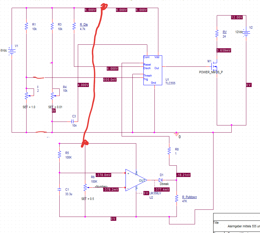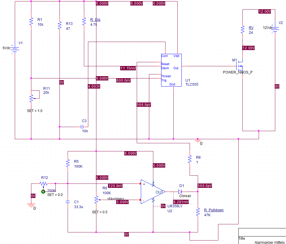 Hallo, wie gestern besprochen, möchte ich euch heute fragen, wie ich das neue Projekt realisieren kann. Wenn ein geschlossener Kontakt geöffnet wird, soll nach einiger Zeit* ein Alarm ausgelöst werden. Dieser Alarm ist ein Leuchtmittel (6V, 12W), welches zu leuchten anfängt. Nach einiger Zeit bedeutet, dass kurze Stromausfälle von ≤ 2 Sekunden oder Wackler am Kontakt nicht das Auslösen des Alarms bewirken. Ich möchte das Ganze als elektronische Schaltung entwickeln, daher ist kein Mikroprozessor gewünscht. Ich nutze aktuell „nur“ PSpice for TI 2020, daher habe ich nicht alle realen Bauteile in den Librarys. Das Wichtigste ist aber vorhanden. Derzeit simuliere ich den Kontakt mittels einer Puls-Quelle (0V bedeutet Kontakt geöffnet). Ich dachte an eine Lösung wie etwa: „Dauert es zu lange, wird eine Schwellspannung erreicht bzw nicht mehr erreicht“. Die Versorgungsspannung möchte ich kleinhalten, circa 6 V. Ich habe auch bereits gelesen, dass ein astabiler Multivibrator verwendet werden kann, oder auch ein Komparator, aber ich bin mir noch unschlüssig, was besser ist. Derzeit simuliere ich die Schaltung mit einer invertierenden Komparatorschaltung. Ich weiß, es gibt fertige Lösungen zu kaufen, aber ich möchte hiermit etwas lernen. Ich würde mich freuen, wenn ihr mir dabei helfen könntet, die Schaltung zusammenzustellen. R_V ist mein Verbraucher, sprich Glühbirne.