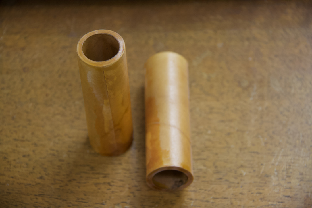 aus verleimten Zeichenkarton hergestellt und in Schellack getränkt.Die