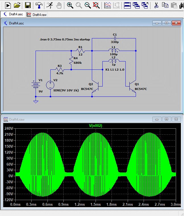 Hier ein interessantes Zwischenergebnis bei der Optimierung des MW-Testsenders mit minimalem Bauteileeinsatz - das kommt raus wenn der Modulationsgrad zu hoch eingestellt ist: Ostern! Mal wieder ein Detektorempfänger! Die Frage ist natürlich, ob die BC549C die 320Vss an den Kollektoren überstehen würden...