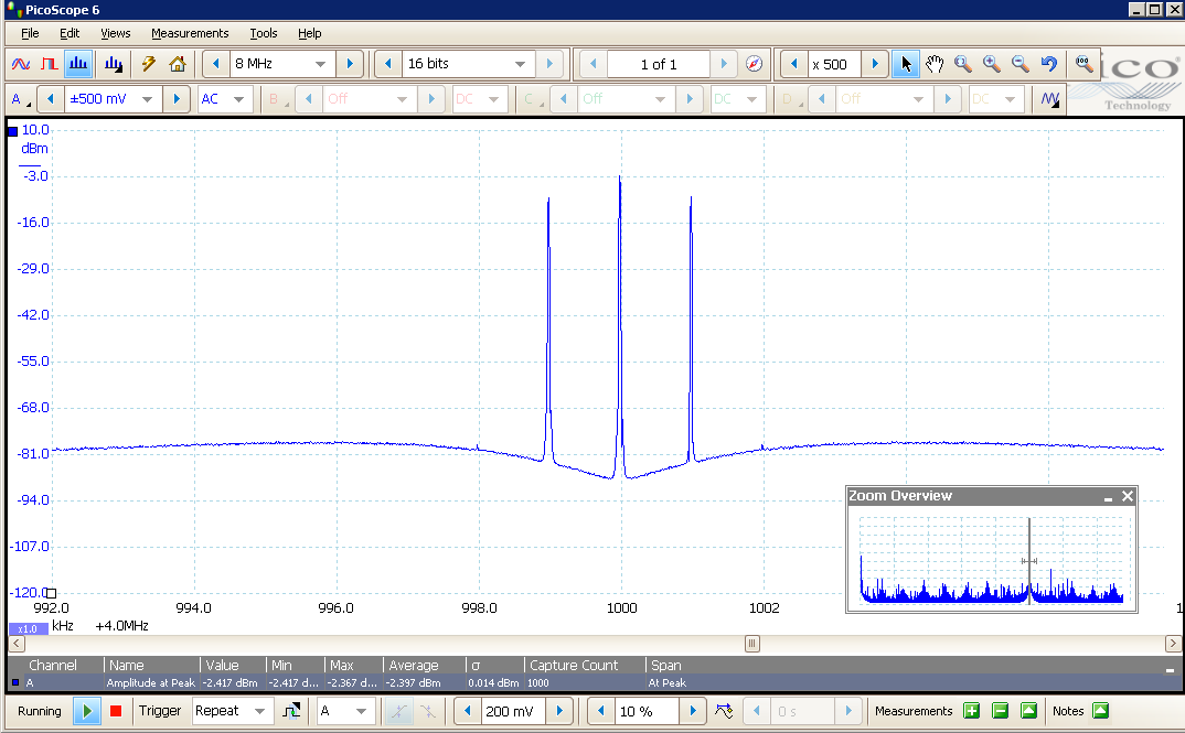 Da ich feststellen musste, dass die Geräte ihre Kurven gerne "glattrechnen" habe ich mir Single Trigger angesehen, um herauszubekommen wie das Rauschewn wirklich ist, denn einige der Kurven aus 01 sahen "zu schön" aus. 02 Sin 1KHz single Trigger