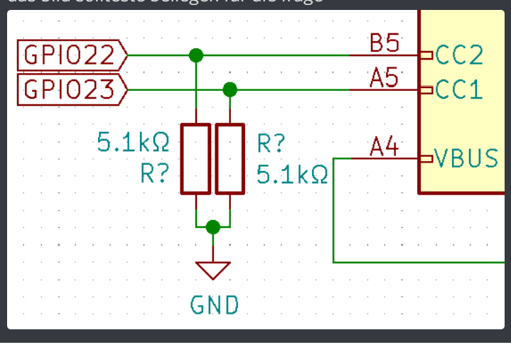 Ich hätte eine Frage zu USB-C. Ich habe ein USB device auf einem Microcontroller realisiert und möchte nun eine USB-C Buchse auf meinem PCB löten. Dafür möchte ich aber auch erkennen, ob ein Host angeschlossen ist und falls ja, ob dieser "Flipped" oder "Unflipped" das Kabel angeschlossen hat und zudem wieviel Strom dieser maximal liefern kann. Dafür habe ich mir gedacht, dass ich, wie im folgenden Bild zu sehen ist, zwei gpios meines Microcontroller mit jeweils CC1 und CC2 verbinde und dann die Spannung mit einem ADC auslese. Jetzt zu meiner Frage: Mein Microcontroller kann maximal 3.3v an den gpios vertragen und deswegen wollte ich fragen, ob ich bei USB-C gefahr laufe, dass die Spannung an den gpios über 3.3v steigt? Hierbei hat mich unter anderem verunsichert, dass bei USB-C der Host VCONN (für elektrisch markierte kabel) an CC2 oder CC1 angelegt wird und die Spannung von VCONN ist ja 4.75 bis 5.5V.