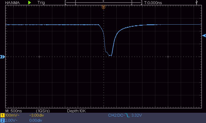 Falk B. schrieb: > Messen. Dann sehen wir weiter. jawohl! Teo D. schrieb: > Dom S. schrieb: >> ich messe gerade statisch an, also Tastverhältnis >> 100%. > Wo genau die Gate-Spannung, direkt an den Pins?! ja, direkt am Gate-Pin, nach dem Serienwiderstand . Also - tatsächlich sehe ich bei Vollaussteuerung des PCA9685 mit 4095 - 0xfff immer noch einen kurzen Spannungseinbruch. Siehe Anhang. Alle 2ms - passt zur 500Hz PWM-Frequenz. Da könnte ihr auch die Flanken anschauen. Das ist ein nachrangiges Problem, dass ich mir noch anschauen muss. Jedoch spielt das für die Temperatur der MOSFETS keine (große) Rolle. Um das auszuschließen, hab ich das Gate nämlich jetzt einfach fest an 5V gefädelt. Die Spannungseinbrüche sind auch weg (am Oszi verifiziert) Trotzdem messe ich noch 61°C am Mosfet. Nochmal: ich hab den PCA9685 aus dem Spiel genommen, der MOSFET wird statisch mit 5V am Gate versorgt, direkt aus dem LDO. Der Strom beträgt 1A. Das Case hat > 60°. Da stimmt doch was nicht...