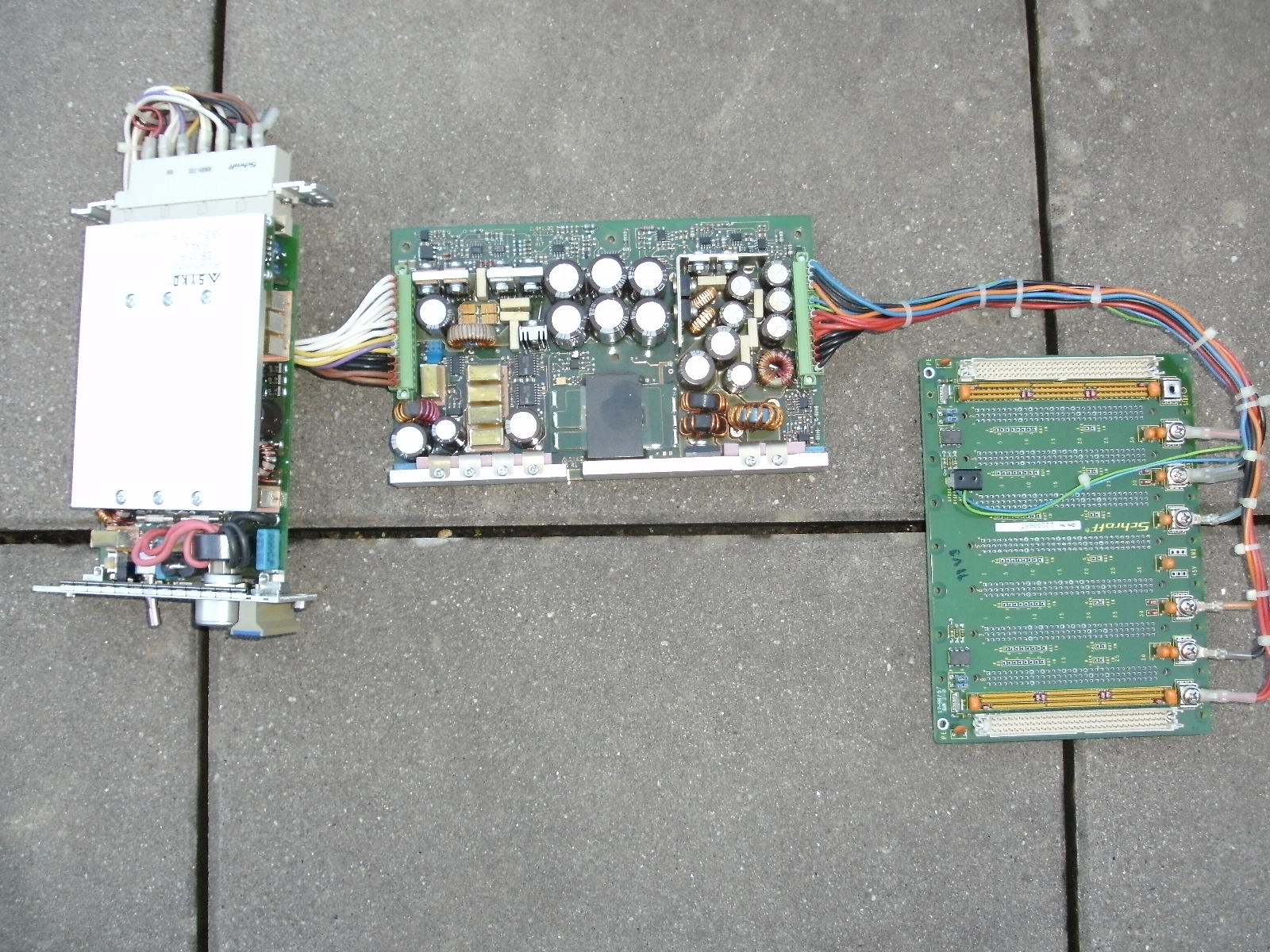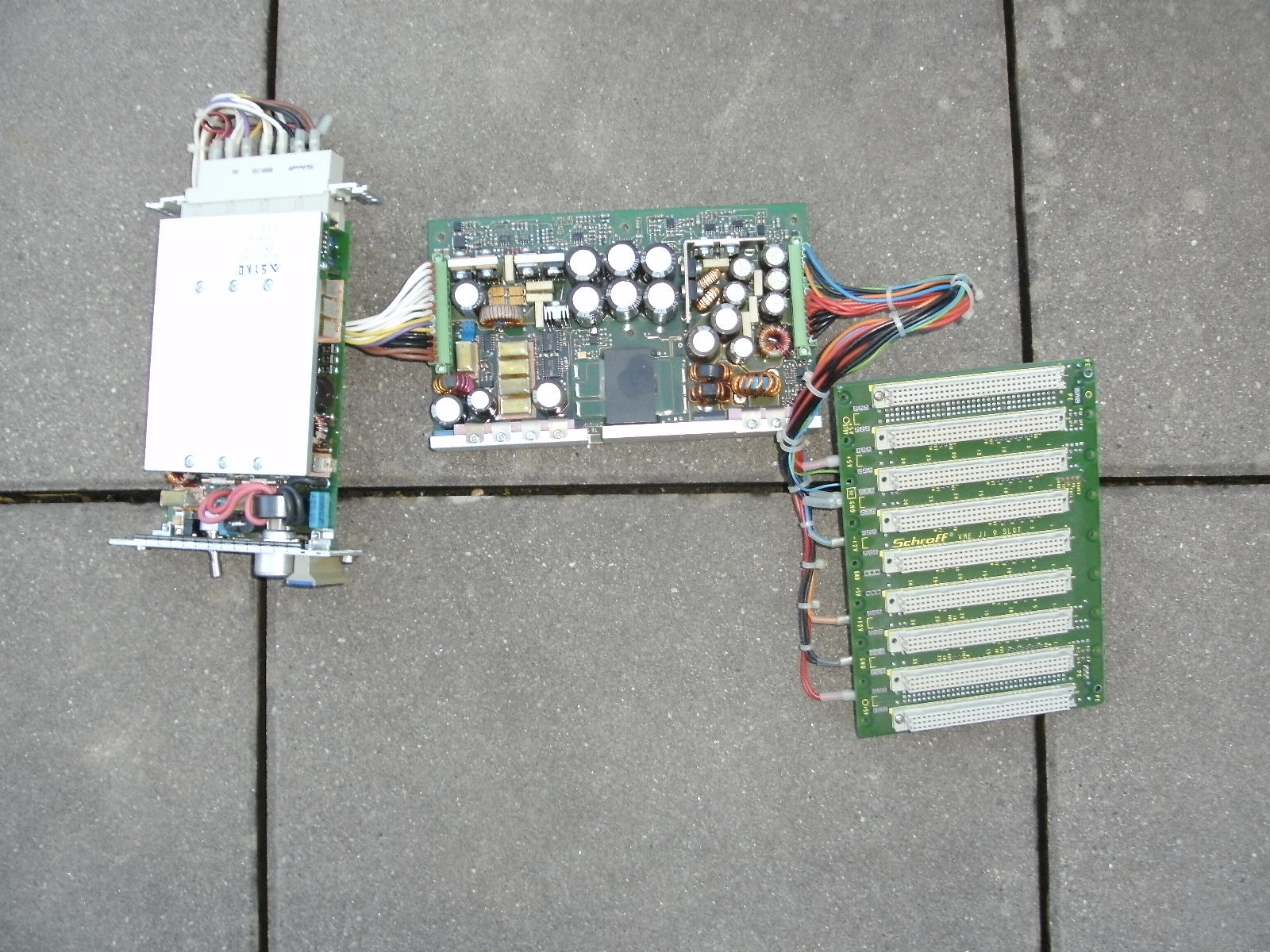Verkaufe ein Netzteil mit 5V/15A sowie +/-12VV 1A Ausgang. Der Eingangsspannungsbereich ist 6...34V, ursprüngliche Anwendung war ein Projekt im Fahrzeug (mobile Datenerfassung mit VME Bus gestütztem System, eingesetzt im PKw und LKw (12 bzw. 24V Bordnetz. D.h. das Teil kommt mit den widrigen Verhältnissen bei (mildem) Startspannungseinbruch, Überspannung, etc sehr gut klar. Vereinfacht gesagt: Das Netzteil hat ein Eingangsplatine die die 6...34V verpolgeschützt auf stabile 13,3V bringt (buck-boost), nennt sich Syko Regenerator. Danach kommt ein Schaltnetzteil, das die +5 und +/-12V erzeugt. Mit dazu gibt es die VME bus (?) Backplane, 9 Steckplätze. Das Teil hat bis zum Ausbau einwandfrei funktioniert, ich gehe deshalb davon aus das es tut. Aktuell prüfen kann ich es nicht (Messaufbau existiert nicht mehr) Die Bilder zeigen ein paar Details. Ich möchte 25€für ein Netzteil, Versand falls gewünscht zusätzlich 7€ innerhalb Deutschland. Es sind 2 derartige Netzteile vorhanden, wenn jemand beide möchte fällt nur einmal Versand an. Kontakt bitte via PN