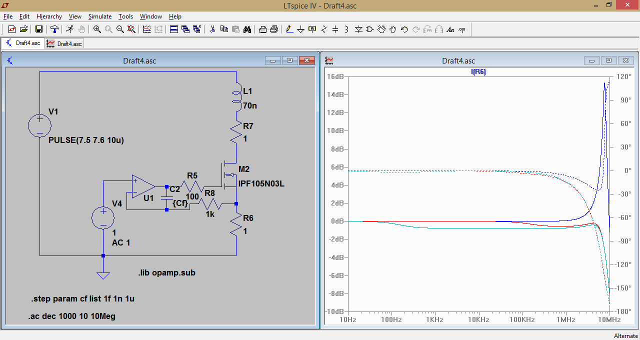 Vincent R. schrieb: > u hast ihn aber in deiner Simulation zwischen > Masse und nichtinvertierenden Eingang gesetzt. Das habe ich getan, um Vincent R zu zeigen, dass es wohl einen Unterschied macht, ob ein RC-Tiefpass am Eingang vorliegt oder ob das C in die Rückkopplung kommt. Vincent R. schrieb: > Du hast ihn aber in deiner Simulation zwischen > Masse und nichtinvertierenden Eingang gesetzt. Bei dir hat er dann > tatsächlich keinen Einfluss mehr auf die Rückkopplung Doch, klar hat er den. Wenn man C unnötig groß wählt, reduziert das die Bandbreite der KSQ gegenüber Änderungen des Sollwerts. Wenn das den TO stört, sollte der die Kapazität kleiner wählen (aber immer noch groß genug, dass die Stabilität gewährleistet ist). Siehe im Anhang die Simu Cf_variation.png. Mit 1µF in der Rückkopplung verliert die Stromquelle schon ab 100Hz an Genauigkeit. Nimmt man statdessen 1nF in die Rückkopplung, ist diese Schaltung laut Simu immer noch stabil und folgt bis 100kHz dem Eingangswert. Nimmt man 1fF (also einen vernachlässigbare kleinen Kondensator in der Rückkopplung) ist die Schaltung zwar am schnellsten. Aber das Peaking bei 10MHz zeigt, dass sie instabil werden und mit 10MHz schwingen kann. Vincent R. schrieb: > Mein Vorschlag war, den Kondensator zwischen Masse und invertierenden > Eingang zu schalten. Du meinst wie im Anhang C_an_inv.png gezeigt? Damit frisst du dem Regelkreis die Phasenreserve weg. Die Simu zeigt den Frequenzgang dieser Schaltungsvariante, die ideale Stromquelle hätte eine waagerechte Linie bei 0dB.