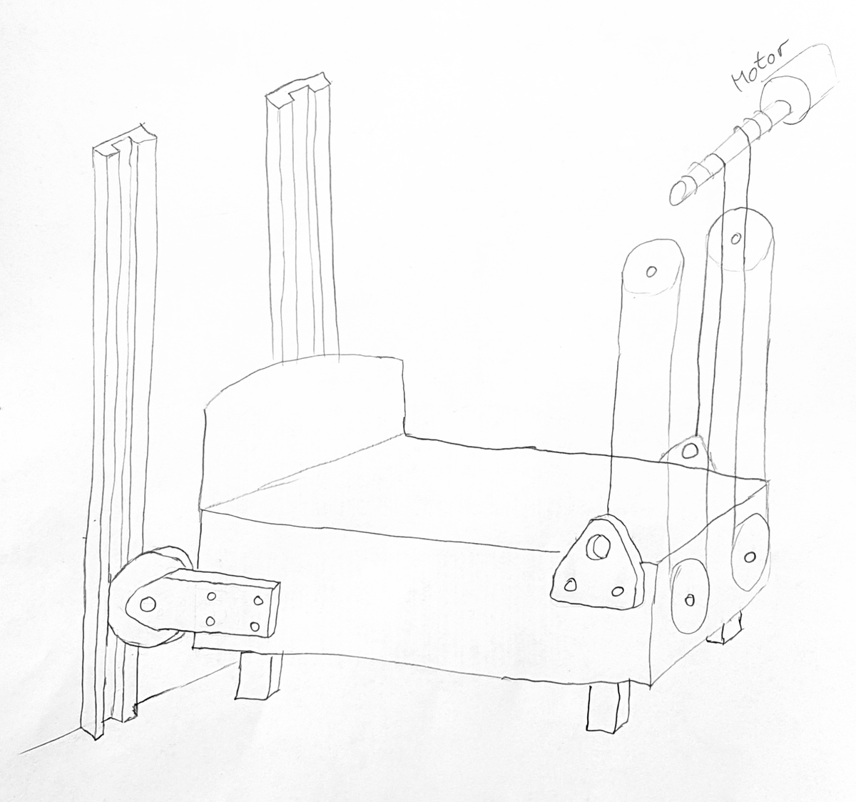 Deine Konstruktion so wie auf er Zeichnung wird nicht funktionieren. ;) Sobald der Motor an fährt kippt das Bett um. Du musst das Bett an 4 Ecken mit einen Seil befestigt was dann über eine Super-Rolle die Stränge Sammelt und abführt.