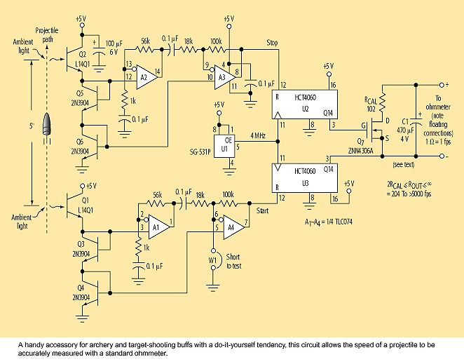 Stephen Woodward hat das vor zwei Jahrzehnten auf einfache Weise mit einem Ohmmeter und Fototransistoren gelöst. Der Referenzartikel war für mich nicht mehr auffindbar. https://www.electronicdesign.com/technologies/displays/article/21750861/measure-projectile-velocity-optically-with-an-ohmmeter Das Bild ist nicht anscheinend nicht mehr online, siehe oben. Arno