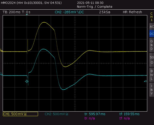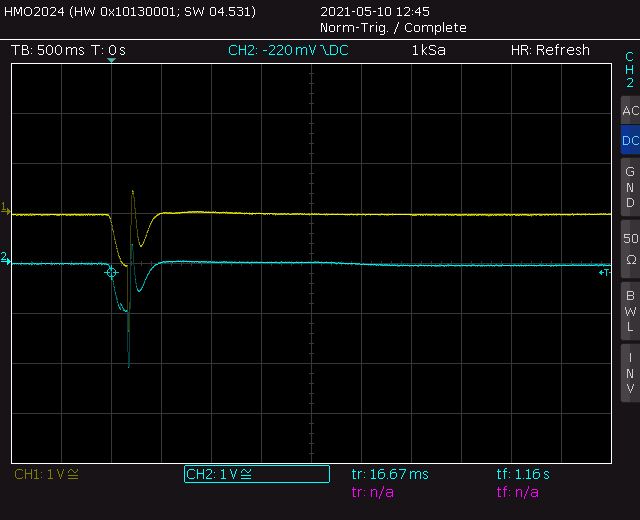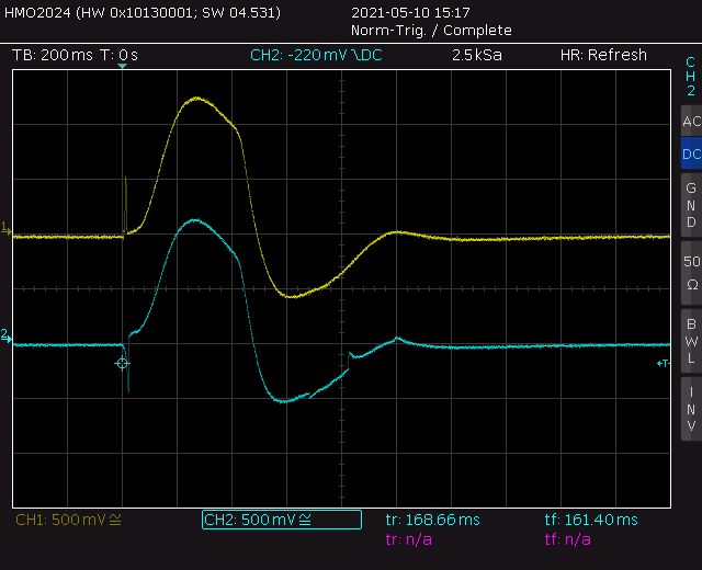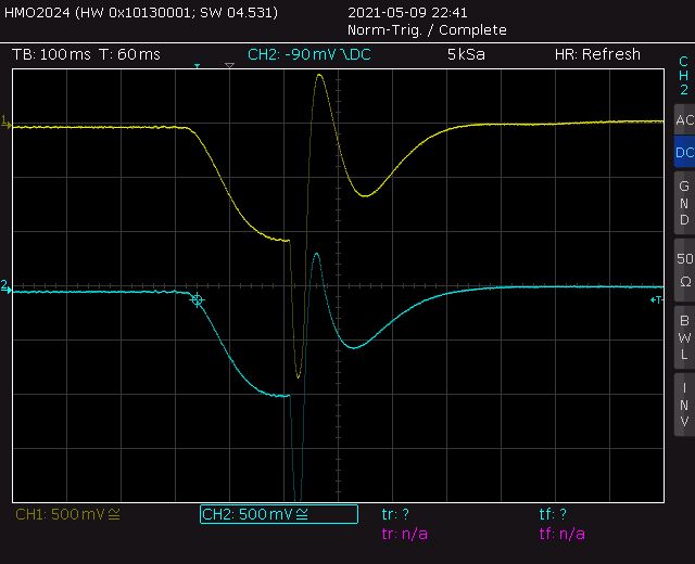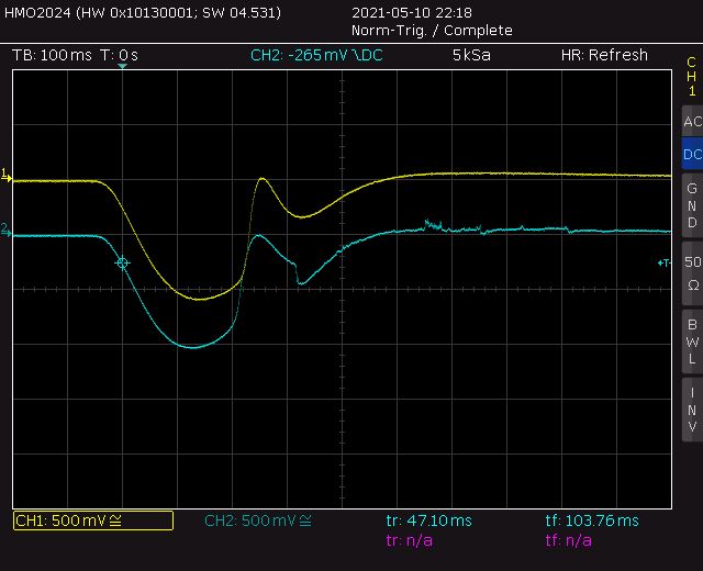 Hier schon mal die Screenshots vom Aus- und Einschalten, blau der "Wackelkandidat". Noch nicht ganz perfekt, weil teilweise über den Darstellungsbereich hinaus. Aber dass sie frei von Schwingungen und weitgehend identisch sind, ist schon zu erkennen. Ich schalte nicht unnötig aus, aber heute Nachmittag gibt's wahrscheinlich noch zwei Screenshots. Skalierung: Am Kopfhörer-Ausgang, aber noch weiter geteilt, also die tatsächlichen Spannungen sind im Moment noch unbekannt. Wenn sie hier frei von Schwingungen sind, heißt das noch lange nicht, dass sie das auch im Fehlerfall sind.