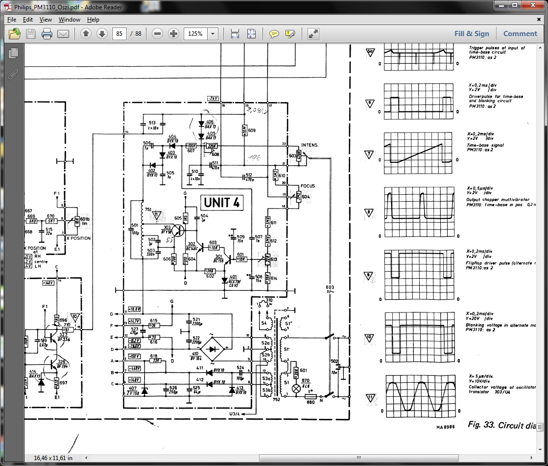 Habe vor kurzem ein 70-er Jahre Oszi Philips PM3110 in die Hände bekommen. Da beim Einschalten kein Strahl sichtbar wird vermute ich ein Fehler in der Hochspannungs-Erzeugung. Die Betriebsanleitung inklusive Schaltpläne habe ich aus dem Internet heruntergeladen. Leider verstehe ich diese Schaltung nicht so ganz. Was ich sagen kann ist dass das Oszillator Signal [11] in Ordnung ist. Diese Spannung wird anscheinend mit einem Spartransformator hochtransformiert. Die Dioden BYX10/BAX13 sind vermutlich ein Spannungsverfielfacher. So eine Art Hochspannungs-Kaskade? Die Spannung an der Katode pin-16 der Bild-Røhre ist ca 2000V plus. Sollte eigentlich neg. sein. Die Spannung an der Anode pin-15 liegt etwas høher. Die Notizen sind nicht von mir das kam so aus dem Internet. Vieleicht kann mir ja jemand einen Tipp geben wie das genau funktioniert und wie man das am besten testet.