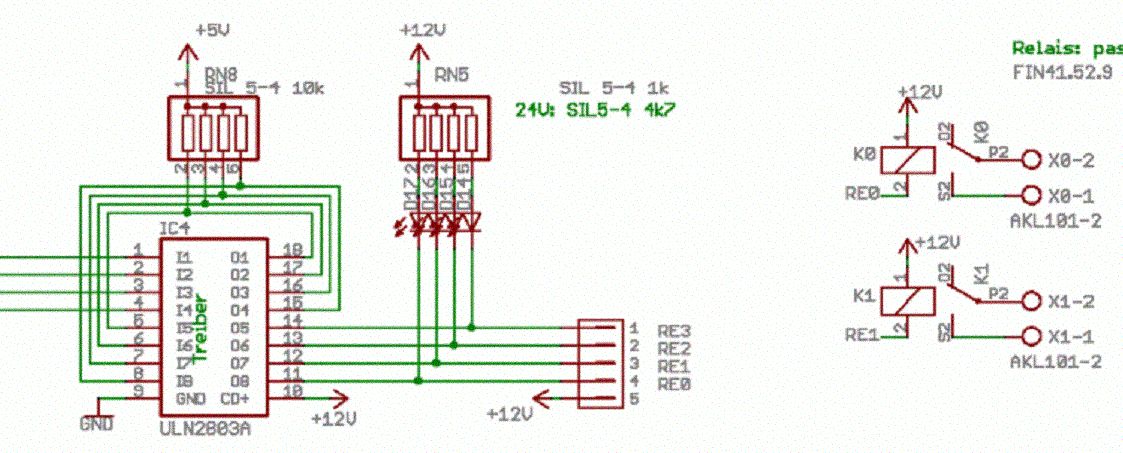 Hi und Servus! Ich hätte da mal eine kleine Frage! Es geht um ein µ-Controller-Board und eine passende Treiberstufe. Je Port hat mein 80C35-Board 8Bit. Diese haben bei aktivierung 5V+. Nun wollte ich Treiberstufen anhängen, um Relais zu schalten mit diesen Treiberstufen. Es ist eine 8-Kanal Treiberstufe "ULN2803" welche ich zur Verfügung habe. Die Frage ist nun wie schließe ich die Treiberstufen an, damit ich das schaffe so? Ich blick mit dem IC nicht so ganz durch, deswegen der Post hier! Kann mir jemand sagen welchen Pin ich auf mein µC setzen muss, was auf Masse oder Spannung? Und wo kommen leztendlich meine Relais dran? (-Anderer Pin vom Relais dann auf Masse oder +?) Hier noch ein Link zum Treiber: http://www2.produktinfo.conrad.com/datenblaetter/150000-174999/171824-da-01-en-ULN_2801_03_04.pdf Ich bin für jede Hilfe sehr Dankbar!!! MfG T-G-läser