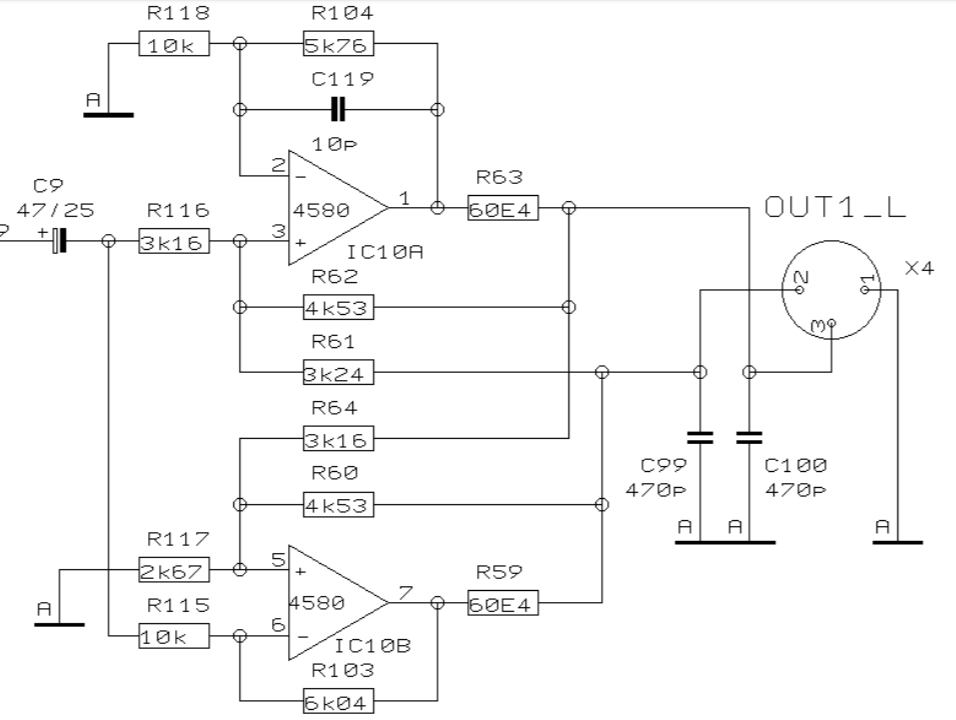 Guten Morgen, Nachtschicht ! Die Schaltung sieht nach einer Modifikation von "Hay's Circuit" aus. Eine ähnliche Schaltung ist z.B. im symmetrischen Ausgang der dbx 1231 Eq (mit NE5532) zu finden. Der Sinn der Sache besteht darin, die Ausgangsspannung eines OUT um 6dB anzuheben, falls der andere OUT gegen Masse kurzgeschlossen wird (bei unsymmetrischer Leitungsführung / Steckern). Damit ist die Differenz zwischen + und - Out wieder gleich. Die Dimensionierung wird den Parametern des 4580 geschuldet sein. Theoretisch wäre die Bestückung "symmetrisch". Mann kann einen symmetrischen Ausgang auch einfacher mit THAT1646 oder DRV134 etc. aufbauen. ------- RRRRRRR !!!! --------