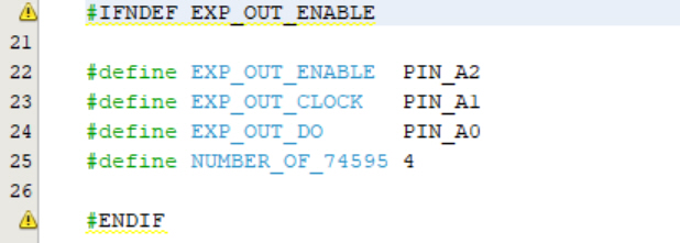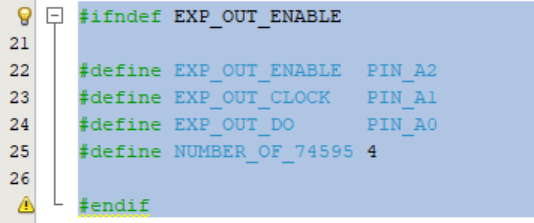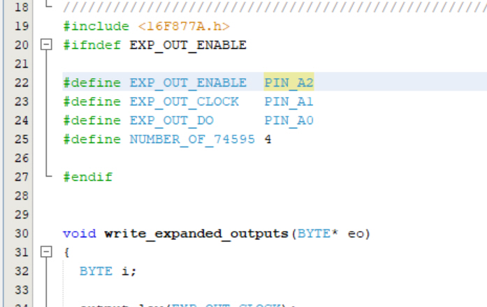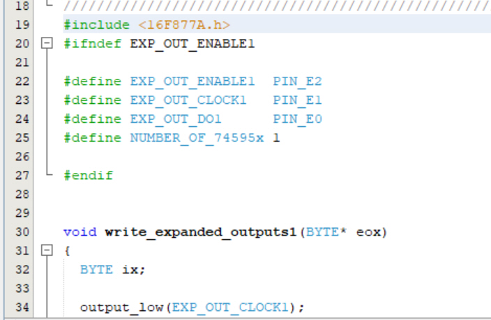 Es sieht so aus als ob die Fehler beider Dateien gleich sind. Hier auch die display-Datei: #ifndef EXP_OUT_ENABLE #define EXP_OUT_ENABLE PIN_A2 #define EXP_OUT_CLOCK PIN_A1 #define EXP_OUT_DO PIN_A0 #define NUMBER_OF_74595 4 #endif void write_expanded_outputs(BYTE* eo) { BYTE i; output_low(EXP_OUT_CLOCK); output_low(EXP_OUT_ENABLE); for(i=1;i<=NUMBER_OF_74595*8;++i) { // Clock out bits from the eo array if((*(eo+(NUMBER_OF_74595-1))&0x80)==0) output_low(EXP_OUT_DO); else output_high(EXP_OUT_DO); shift_left(eo,NUMBER_OF_74595,0); output_high(EXP_OUT_CLOCK); output_low(EXP_OUT_CLOCK); } output_high(EXP_OUT_ENABLE); output_low(EXP_OUT_ENABLE); }