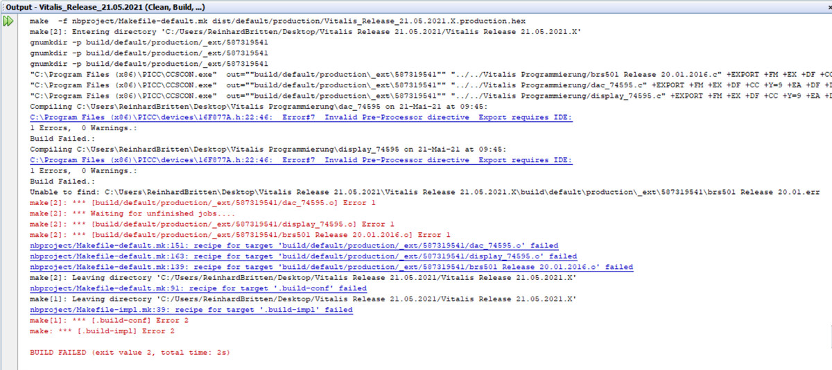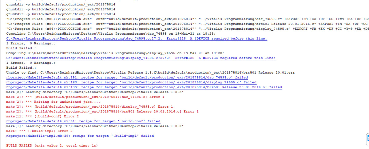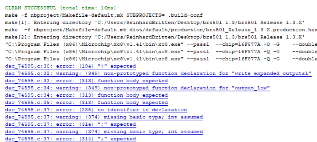 Das sind die Fehlermeldungen!! CLEAN SUCCESSFUL (total time: 26ms) make -f nbproject/Makefile-default.mk SUBPROJECTS= .build-conf make[1]: Entering directory 'C:/Users/ReinhardBritten/Desktop/brs501 1.3/brs501 Release 1.3.X' make -f nbproject/Makefile-default.mk dist/default/production/brs501_Release_1.3.X.production.hex make[2]: Entering directory 'C:/Users/ReinhardBritten/Desktop/brs501 1.3/brs501 Release 1.3.X' "C:\Program Files (x86)\Microchip\xc8\v1.41\bin\xc8.exe" --pass1 --chip=16F877A -Q -G --double=24 --float=24 --opt=+asm,+asmfile,-speed,+space,-debug,-local --addrqual=ignore --mode=free -P -N255 --warn=-3 --asmlist -DXPRJ_default=default --summary=default,-psect,-class,+mem,-hex,-file --output=default,-inhx032 --runtime=default,+clear,+init,-keep,-no_startup,-osccal,-resetbits,-dow nload,-stackcall,+clib --output=-mcof,+elf:multilocs --stack=compiled:auto:auto "--errformat=%f:%l: error: (%n) %s" "--warnformat=%f:%l: warning: (%n) %s" "--msgformat=%f:%l: advisory: (%n) %s" -obuild/default/production/display_74595.p1 display_74595.c "C:\Program Files (x86)\Microchip\xc8\v1.41\bin\xc8.exe" --pass1 --chip=16F877A -Q -G --double=24 --float=24 --opt=+asm,+asmfile,-speed,+space,-debug,-local --addrqual=ignore --mode=free -P -N255 --warn=-3 --asmlist -DXPRJ_default=default --summary=default,-psect,-class,+mem,-hex,-file --output=default,-inhx032 --runtime=default,+clear,+init,-keep,-no_startup,-osccal,-resetbits,-dow nload,-stackcall,+clib --output=-mcof,+elf:multilocs --stack=compiled:auto:auto "--errformat=%f:%l: error: (%n) %s" "--warnformat=%f:%l: warning: (%n) %s" "--msgformat=%f:%l: advisory: (%n) %s" -o"build/default/production/brs501 Release.p1" "brs501 Release.c" "C:\Program Files (x86)\Microchip\xc8\v1.41\bin\xc8.exe" --pass1 --chip=16F877A -Q -G --double=24 --float=24 --opt=+asm,+asmfile,-speed,+space,-debug,-local --addrqual=ignore --mode=free -P -N255 --warn=-3 --asmlist -DXPRJ_default=default --summary=default,-psect,-class,+mem,-hex,-file --output=default,-inhx032 --runtime=default,+clear,+init,-keep,-no_startup,-osccal,-resetbits,-dow nload,-stackcall,+clib --output=-mcof,+elf:multilocs --stack=compiled:auto:auto "--errformat=%f:%l: error: (%n) %s" "--warnformat=%f:%l: warning: (%n) %s" "--msgformat=%f:%l: advisory: (%n) %s" -obuild/default/production/dac_74595.p1 dac_74595.c display_74595.c:20: warning: (107) illegal # directive "IFNDEF" display_74595.c:20: warning: (163) unexpected text in control line ignored display_74595.c:27: warning: (107) illegal # directive "ENDIF" display_74595.c:30: error: (194) ")" expected display_74595.c:32: warning: (349) non-prototyped function declaration for "write_expanded_outputs" display_74595.c:32: error: (313) function body expected display_74595.c:34: warning: (349) non-prototyped function declaration for "output_low" display_74595.c:34: error: (313) function body expected display_74595.c:35: error: (313) function body expected display_74595.c:37: error: (285) no identifier in declaration display_74595.c:37: warning: (374) missing basic type; int assumed display_74595.c:37: error: (314) ";" expected display_74595.c:37: warning: (374) missing basic type; int assumed display_74595.c:37: error: (314) ";" expected display_74595.c:37: error: (285) no identifier in declaration display_74595.c:37: warning: (374) missing basic type; int assumed display_74595.c:37: error: (314) ";" expected display_74595.c:42: error: (285) no identifier in declaration display_74595.c:42: warning: (374) missing basic type; int assumed display_74595.c:42: error: (314) ";" expected dac_74595.c:20: warning: (107) illegal # directive "IFNDEF" dac_74595.c:20: warning: (163) unexpected text in control line ignored dac_74595.c:27: warning: (107) illegal # directive "ENDIF" dac_74595.c:30: error: (194) ")" expected dac_74595.c:32: warning: (349) non-prototyped function declaration for "write_expanded_outputs1" dac_74595.c:32: error: (313) function body expected dac_74595.c:34: warning: (349) non-prototyped function declaration for "output_low" dac_74595.c:34: error: (313) function body expected dac_74595.c:35: error: (313) function body expected dac_74595.c:37: error: (285) no identifier in declaration dac_74595.c:37: warning: (374) missing basic type; int assumed dac_74595.c:37: error: (314) ";" expected dac_74595.c:37: warning: (374) missing basic type; int assumed dac_74595.c:37: error: (314) ";" expected dac_74595.c:37: error: (285) no identifier in declaration dac_74595.c:37: warning: (374) missing basic type; int assumed dac_74595.c:37: error: (314) ";" expected dac_74595.c:42: error: (285) no identifier in declaration dac_74595.c:42: warning: (374) missing basic type; int assumed dac_74595.c:42: error: (314) ";" expected make[2]: *** [build/default/production/dac_74595.p1] Error 1 make[2]: *** Waiting for unfinished jobs.... (908) exit status = 1 nbproject/Makefile-default.mk:131: recipe for target 'build/default/production/dac_74595.p1' failed make[2]: *** [build/default/production/display_74595.p1] Error 1 make[1]: *** [.build-conf] Error 2 make: *** [.build-impl] Error 2 (908) exit status = 1 nbproject/Makefile-default.mk:139: recipe for target 'build/default/production/display_74595.p1' failed make[2]: Leaving directory 'C:/Users/ReinhardBritten/Desktop/brs501 1.3/brs501 Release 1.3.X' nbproject/Makefile-default.mk:91: recipe for target '.build-conf' failed make[1]: Leaving directory 'C:/Users/ReinhardBritten/Desktop/brs501 1.3/brs501 Release 1.3.X' nbproject/Makefile-impl.mk:39: recipe for target '.build-impl' failed BUILD FAILED (exit value 2, total time: 12s)