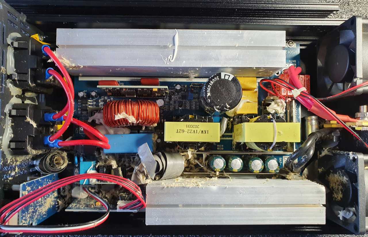 Das wäre eine Erklärung. Ich gehe auch davon aus das der Gute an Temperaturproblemen gestorben ist. Es gibt zwar einen NTC auf dem Kühlkörper aber der sitzt natürlich auf der Seite der Dioden und nicht bei den IGBTs. Auch ist die Belüftung generell etwas mager. Naja mal sehen, falls er wieder zum leben kommt gibt es da bestimmt noch ein paar Möglichkeiten dies zu optimieren. Und für den Spaß noch ein Bild, vor dem "aufräumen"