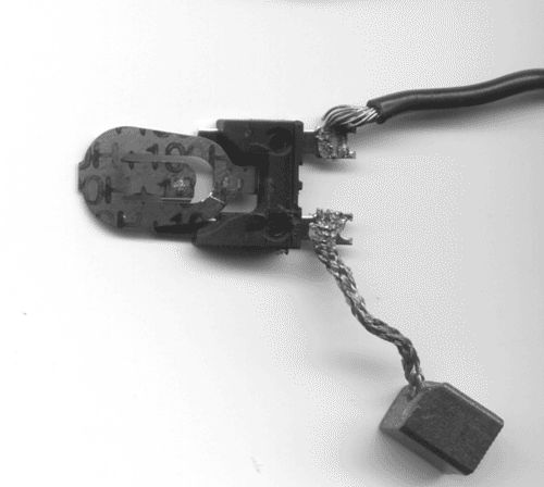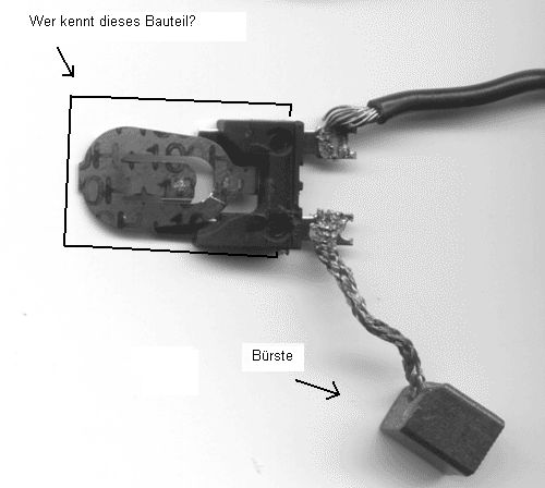 schaut aus wie 'n kohlekontakt vom motorläufer, rechts unten am zipfel der graphitblock, links die feder die ihn auf den läufer kontaktring pressen soll.