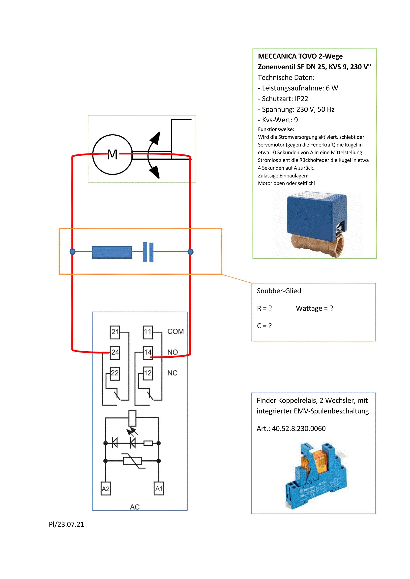 Hallo zusammen, ich bräuchte mal Eure Hilfe. Vorab: Ich bin kein Elektroniker, denke aber einige Grundkenntnisse zu haben. Zu meinem Problem: Meine Solaranlage war ausgefallen. Das Haus habe ich vor ein paar Jahren gekauft, installiert wurde die Anlage bei Neubau. Leider habe ich vom Vorbesitzer nur spärliche Informationen über die Anlage erhalten, dafür aber die Adressen des auführenden Elektrobetriebs und des Heizungsbauers. Die Fehlersuche brachte das Ergebnis, dass eine wohl selbstgebastelte Zusatzplatine, die an der Steuerplatine der Heizung angeschlossen war, durchgebrannt ist. Ein Schlaumeier hatte auf die Kontaktseite der Platine Panzerband geklebt uund so auf das Metallgehäuse des Schaltkastens "gestellt". Der Elektriker wies den Nachbau von sich, der Heizungsbauer ebenso. Beide wussten nicht, was das sei und wollten mir nicht weiterhelfen. So blieb mir nichts anderes übrig, als die Reste zu identifizieren und die Schaltung soweit möglich zu rekonstruieren. Kurzum, es handelt sich um eine Koppelrelais-Schaltung, die ein Motorventil parallel zu der an der Heizungsplatine angeschlossenen Solarpumpe ansteuert. Auf der Suche nach Bauteilen, bin ich dann auf eine fertige Lösung von Finder gekommen (siehe Anhang). Nach Einbau dieses Teils funktioniert die Anlage auch wieder problemlos. Ich fürchte nur, dass durch die induktive Last die Kontakte der Relais bald eins auf die Ohren bekommen und würde daher gerne ein Dämpfungsglied einbauen. In der anhängenden Skizze habe ich die Schaltung dargelegt. Kann mir jemand die Werte für C und R nenne? Ist die Schaltung so richtig, d.h. eine Parallelschaltung zum Motor? Auf der verschmorten Platine befindet sich ein Kondensator mit 33nF und ein verkohlter Widerstand. Ich vermute, dass die beiden Bauteile ebenfalls ein Dämpfungsglied darstellen. Frue mich über jede Hilfe und ja - ich habe auch in der Suchfunktion einiges gefunden, weiß aber nicht ob die Antworten zu meiner Spezifikation passen. Danke an alle für Eure Unterstützung Grüße, Thomas
