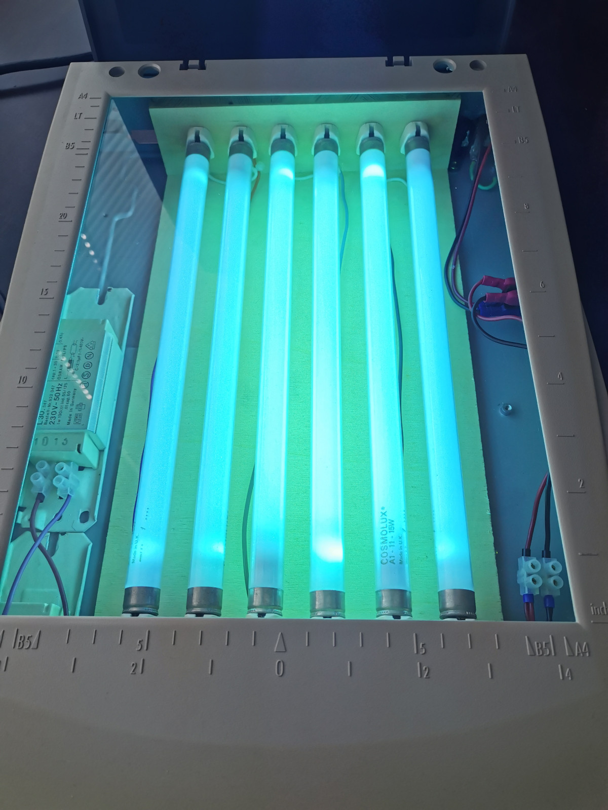 Hallo, ich biete hier meinen selbstgebauten Platinenbelichter mit 6 UV Röhren je 15 W in einem alten Flachbettscanner an. Dazu gehört eine Ätzküvette aus Plexiglas mit Sprudelsteinen, Aquariumpumpe, Ablasshahn und Platinenhalter. Das Fassungsvermögen beträgt ca. 2 Liter. Natürlich dicht. Ich hätte dazu auch noch Natriumpersulfat und NaOH abzugeben sowie ein paar Fotoplatinen (liegen aber schon eine Weile). Das Equipment steht bei mir nur rum, vielleicht ja jemand Verwendung dafür. Vorzugsweise Abholung im Raum Hannover/Göttingen, da recht schwer, sperrig und empfindlich für Versand. Preis VB. Thomas