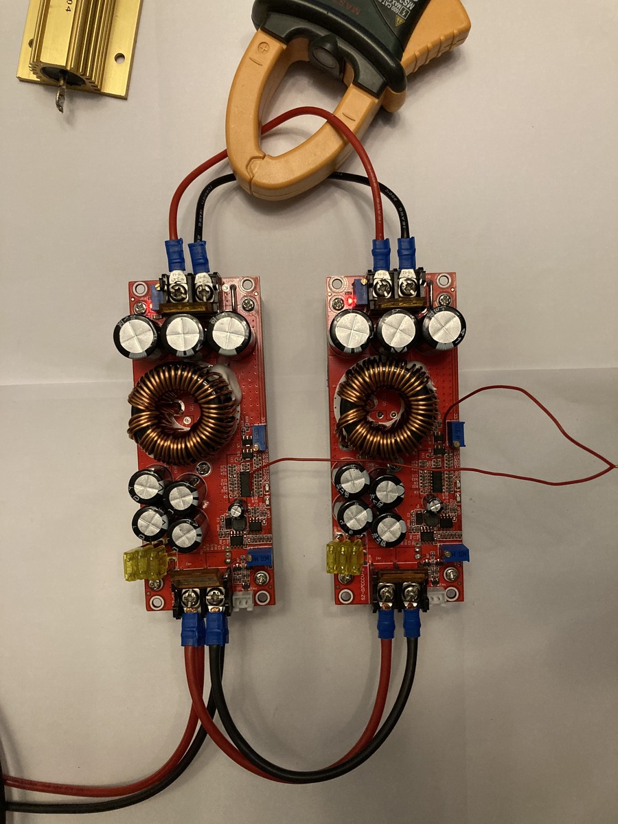 Ich poste jetzt doch noch hier weil die Idee hier entstanden ist. Kann gerne verschoben werden oder als neues Thema eingestellt werden wenn so besser ist. YouTube ist voll mit Testberichte zu diese DC/DC Wandler, vielleicht mache ich mal ein Video dazu. Also: die Idee mit Master/Slave hat in ersten Versuchen überraschend gut funktioniert. In Bild sieht man die zwei Lötstellen. Beim Slave(die untere) sind die Beine 9 und 10 durchgetrennt. Ein 22R fehlt jetzt, weil es einfacher war beim Slave direkt auf B zu löten als auf die kleine 22R Interessanterweise teilt sich die Last trotzdem grob 50/50 zwischen die zwei. Geprüft wurde bis jetzt nur Folgendes: -Immer in 24V/48V Einstellung , Max 10min Beobachtungszeit -Aufstarten mit Last, ohne Last (Max 8A bis jetzt ) -langsames Aufstarten über 24V 1A oder 4A Netzteil -Blitz-Aufstarten über 24V Batterie -wie oben aber mit Antiblitz 33ohm Es muss also noch viel getestet werden bevor man sagt es tut. Mögliche Fragen: - Mostfet Flanken werden flacher weil ein 494 zwei versorgt - PWM Regler neigt mehr zum schwingen weil seine Verstärkung sich verdoppelt hat - und, und , und Aber wenn jemand experimentieren möchte, gerne! So schnell findet man nix vergleichbares in dem Preisbereich