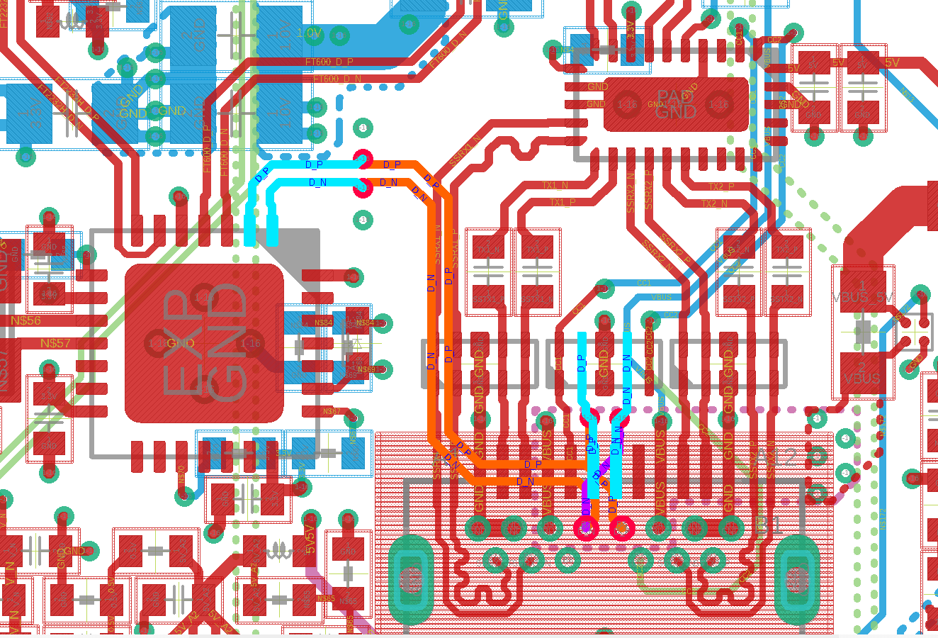 VV V. schrieb: > Was meinst du mit der Kreuzung? Beide D+ und beide D- werden miteinander verbunden. Also nicht D+ mit D- verbinden. Wenn du den Stecker dann in eine Richtung eingesteckt hast, dann wird nur einer seiner D+ und einer seiner D- Pins "grnutzt", der andere ist jeweils ein "offenes Ende" - und das nennt man Stub. An der Verbindung von Kabel -> Stecker -> Buchse -> Leiterbahn hast du also eine kurze Abzweigung die dann ins Leere führt, eine Sackgasse und so ein offenes Ende reflektiert SIgnale schön zurück. Damit das nicht stört sollte diese Sackgasse so kurz wie möglich gehalten werden. Also: Verbinde die beiden D+ und die beiden D- mit einer so kurzen Leiterbahn wie möglich. Edit: Noch zwei Bildchen, einmal eine voll belegte USB-C Buchse für USB3 und USB2, drüber ist der MUX und links ein USB2 HUB zu sehen. Und dann noch eine USB-C Buchse die nur die USB2 Pins herausführt. Da sind die + und - mit 0 Ohm Widerständen verbunden. Beides funktioniert wunderbar.
