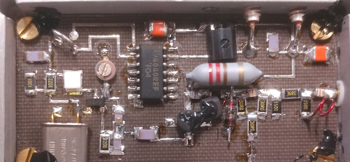 74F04 wird wohl stimmmen. Vermute mal, der linke Durchführungskondensator trägt ein Schaltsignal zum Ein- und Ausschalten des Quarzoszillators (quasi "digitale Amplitudenmodulation"). Das Signal gelangt über Pin 13 auf einen Inverter und dann unter dem IC von Pin 12 direkt oder auf Umwegen auf Pin 1; Pin 2 liefert dann das zu Pin 1 inverse Signal, und die Lötbrücke oben links entscheidet, welches davon zum Oszillator gelangt.