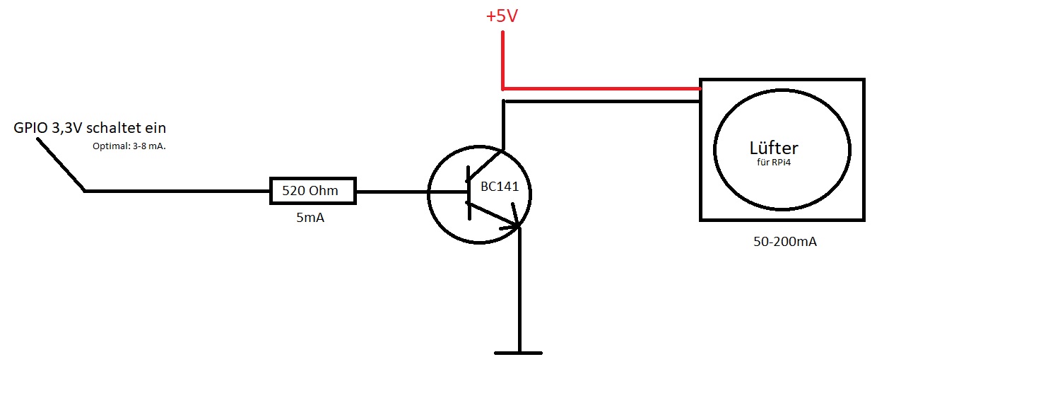 Hallo, ich wollte mir für meinen RPi4 eine Lüftersteuerung bauen wie im Bild. Klappt das so oder ist das Banane ? Es geht nur um die Schaltung des Transistors, nicht wie ich den GPIO zum schalten bringe. Vorwiderstand richtig ? Transistortyp richtig ? Lüfter habe ich noch nicht, aber die die ich gefunden habe liegen bei 50-200mA bei 5V.