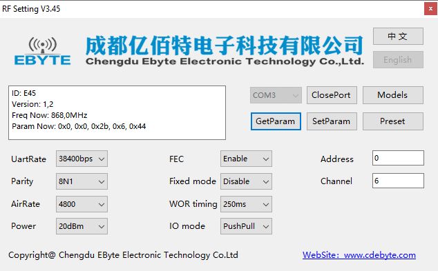 Die Vorgehensweise: Die beiden blauen Jumper vom USB-modul entfernen (M0/M1 auf high), Funkmodul aufstecken und USB Anschluss mit dem PC verbinden. Das Modul kann jetzt parametriert werden. Das RF_setting Programm starten und die Parameter für beide Module setzen. Gleicher Kanal, gleiche Adresse. Baudraten einstellen und Parameter auf die Module schreiben. Die beiden Module (M0 auf low) verhalten sich jetzt wie eine langsame Kabel Halb-Duplex_Verbindung. Mit Hilfe des USB Adapters (mit gesteckten Jumpern) kann man einfach testen.