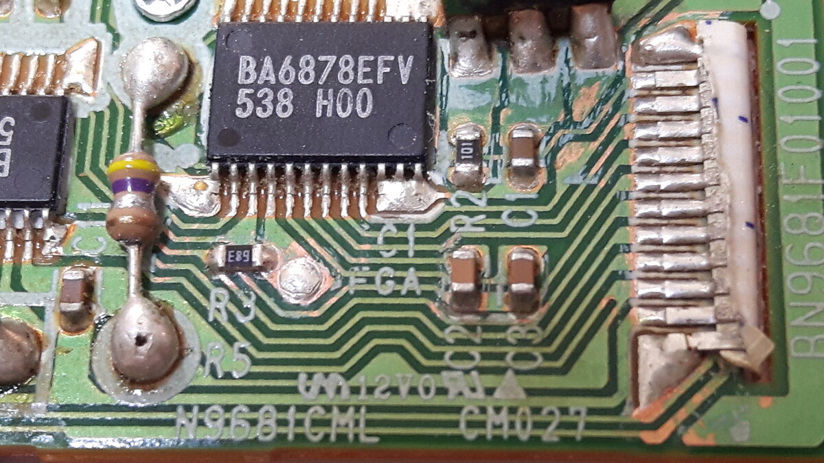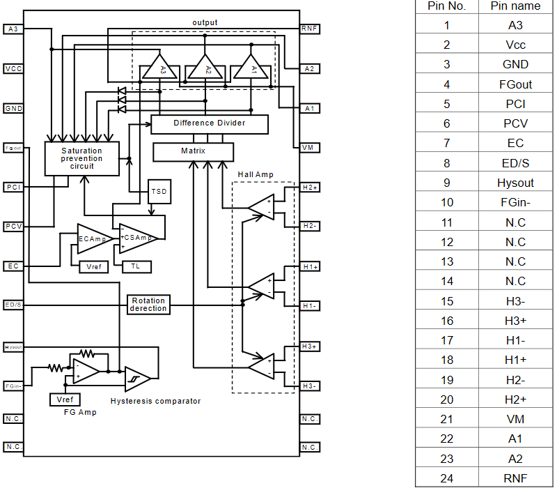 meine Fragerei geht weiter, ich komme noch nicht klar bis jetzt. Das mit dem Blockschaltbild ist soweit klar, nur kann ich das nicht anwenden. Die Schaltung auf der Platine hat irgendwie nix damit zu tun. Das 12er Kabelband habe ich jetzt mal bissel freigelegt, das ist ja der einzige Anschluß an die Platine. direkt angeschlossen vom BA6878 sind : Pin 7 ( EC ), Pin 8 ( ED-S ) und Pin 9 ( Hys out ). Pin 5 ( PCI ) über C3 und Pin 6 ( PCV ) über C2 Pin 4 ( FG out ) über den R3 Pin 3 ( GND ) zusammen mit C2 und C3 Pin 2 ( Vss ) geht nach links Pin 1 ist Spule W Pin 21 ( VM ) ist auch direkt angeschlossen, der erste oben am Kabelband. Der zweite von oben ist über R1 an den Hallsensoren dran. Ich müsste mich also auf das Schaltbild des BA 6878 konzentrieren. Was bedeutet : Pin 2 - Vcc ( ist auf dem Schaltbild nicht angeschlossen ) ? Pin 21 - VM ? Da es nur dieses Kabelband als Zuleitung gibt, was bleibt denn da noch übrig, um eine Spannung anzulegen ? noch ein Foto vom BA6878 Datenblatt