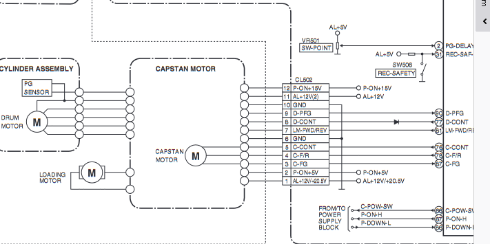 Paul M. schrieb: > Wie wäre es möglich, diesen Motor anzuschließen, mit der vorhandenen > Platine ? Klar, wenn er im VR noch funktioniert hat, warum nicht? Eine neue Platine lohnt aber nicht, nimm ruhig die vorhandene. Du benötigst die Motorspeisung und kannst erstmal alle Anschlüsse mit 'D' (Drum) ignorieren, da du die Kopftrommel ja nicht benutzt. Der Motor bekommt zwei Steuerspannungen: C-Cont ist eine variable Spannung zur Geschwindigkeitsregelung und C-F/R ist für die Drehrichtung. Der Motor wird vermutlich auch zum Spulen benutzt. C-FG liefert eine Wechselspannung, die in der Frequenz proportional zur Drehzahl des Motors ist - ist also ein Ausgang. Welche der vielen Versorgungsanschlüsse benutzt werden, musst du ausprobieren, das ist ohne Detailschaltung nicht zu sagen. Loading Motor wird ignoriert.