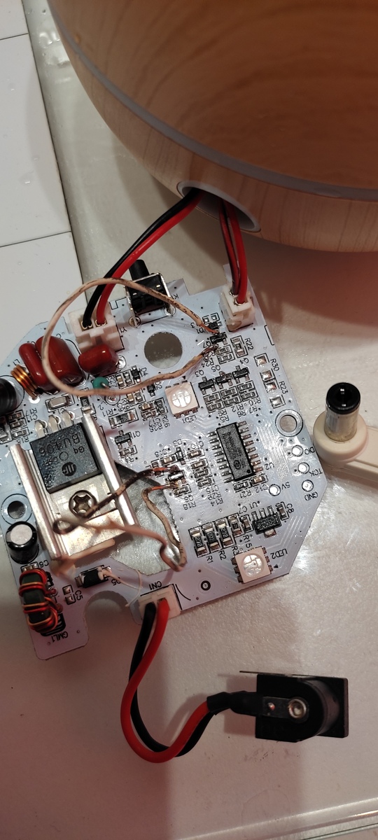 Hallo liebe Leut :) Ich habe einen ÖL-Duft-Diffusor Ding. Das Gerät schaltet sich leider nur an wenn ich den kleinen Taster betätige. Hab ein ähnlich Thema hier gefunden aber das ergab leider keine Lösung. z.B. ein Kondensator an den Taster anschließen ist keine Lösung, da das gerät 3 Modi besitzt. Brauche nur den ersten Modi, also 1 mal draufdrücken ( AN ) fertig. Ich würde gerne einfach meine Steckdose anschalten und zack, "An mit dem Gerät" :D Das Teil läuft mit 24V 0,5A. Löten kann ich hervorragend, am liebsten kleines Kabel von Transistor A zu B löten, wenns so einfach ist. ;) P.s Links ist die Resonanz-Diffusor-Platte rechts ein kleiner Lüfter zu Kühlung