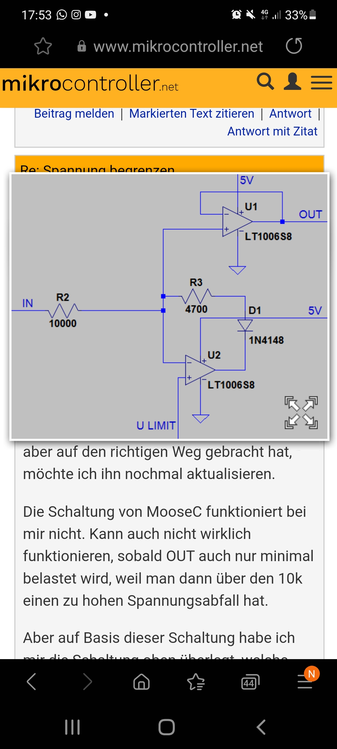 So ich habe gerade eben jede Kombination durch gemessen und es kommen keine sinnvollen Wiederstands Werte raus (diese verändern sich auch garnicht, bei drehen am gasgriff) Ich gehe davon aus das es ein hallsensor ist oder? Lässt sich da nicht sowas wie eine spannungsbegrenzung bauen? Soviel wie ich weiß entspricht 0%gas 0,83v 100% gas 3,62v. So das etwa maximal 2,2v anliegen Lg