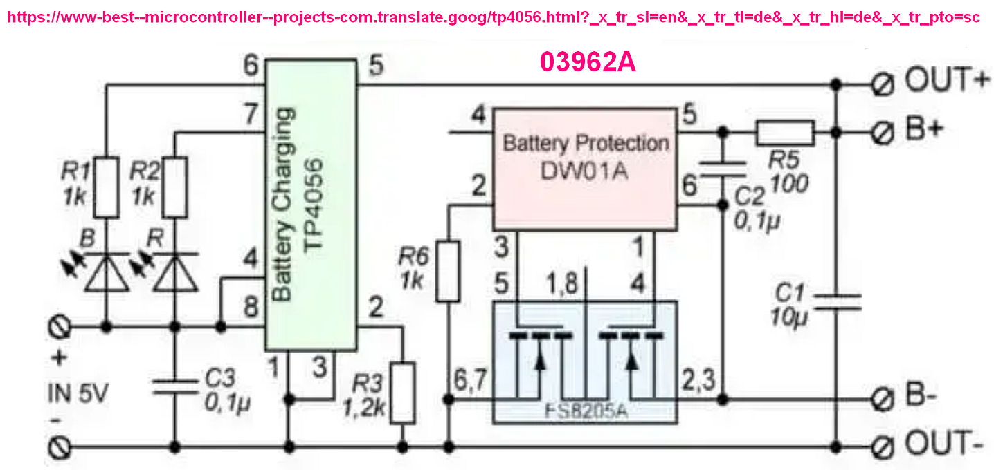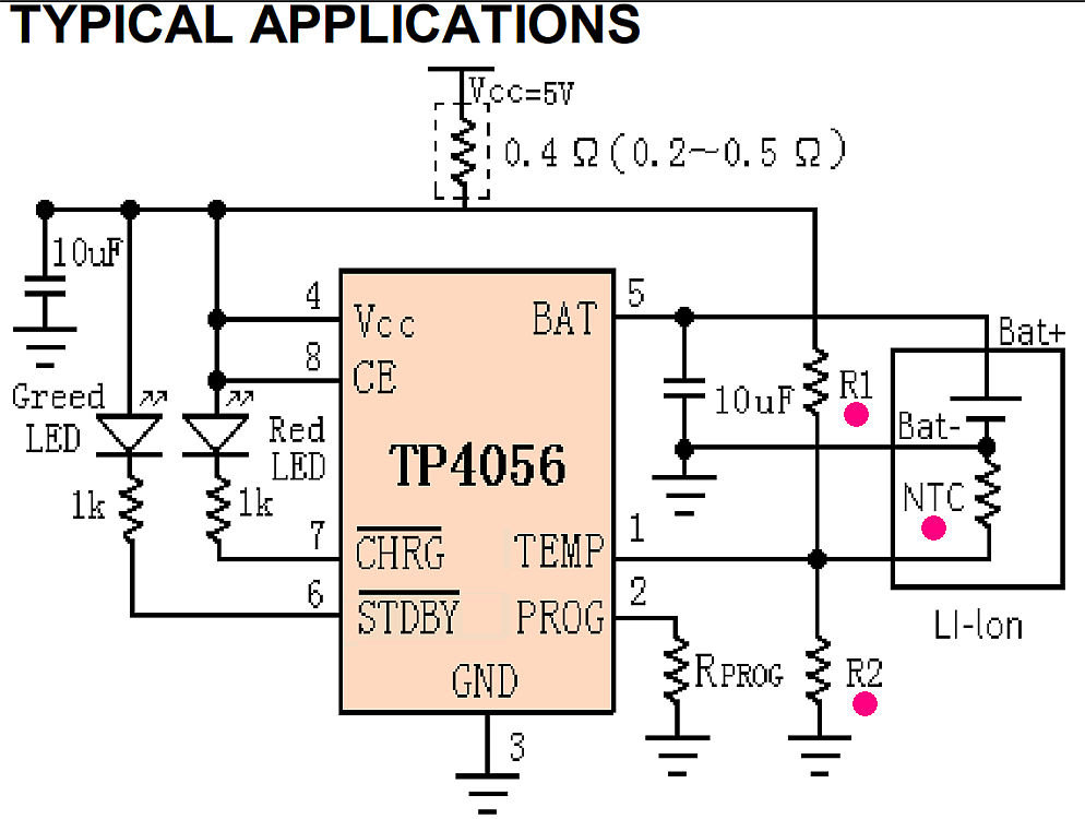 Der Tp4056 wird ja meistens ohne Temperaturüberwachung betrieben und der Pin1 ( TEMP ) dann mit GND verbunden. Ich habe einen 10k-NTC, welcher bei 49°C ca. 4k1 Ohm, bei 45°C ca. 6k0 Ohm und bei 40°C ca. 6k2 Ohm hat. Die Schutzschaltung soll bei ca. <= 5°C und bei ca. >= 42°C ansprechen. Welche Werte müssen dann die einzelnen Widerstände ( R1 & R2 ) haben ? Und warum entfällt nicht einfach R2 und der NTC nimmt dafür seinen Platz ein und wird stattdessen zu diesem parallel geschaltet ? Bei kleiner ca. 45% der 5V-Versorgungsspannung, also 2,25V, wird der Akku als zu heiß zum weiterladen erkannt und bei 80%, also 4,00V, wird der Akku als zu kalt zum Laden erkannt. TEMP(Pin 1) : Temperature Sense Input Connecting TEMP pin to NTC thermistor’s output in Lithium ion battery pack. If TEMP pin’s voltage is below 45% or above 80% of supply voltage VIN for more than 0.15S, this means that battery’s temperature is too high or too low, charging is suspended. The temperature sense function can be disabled by grounding the TEMP pin. Bernd_Stein
