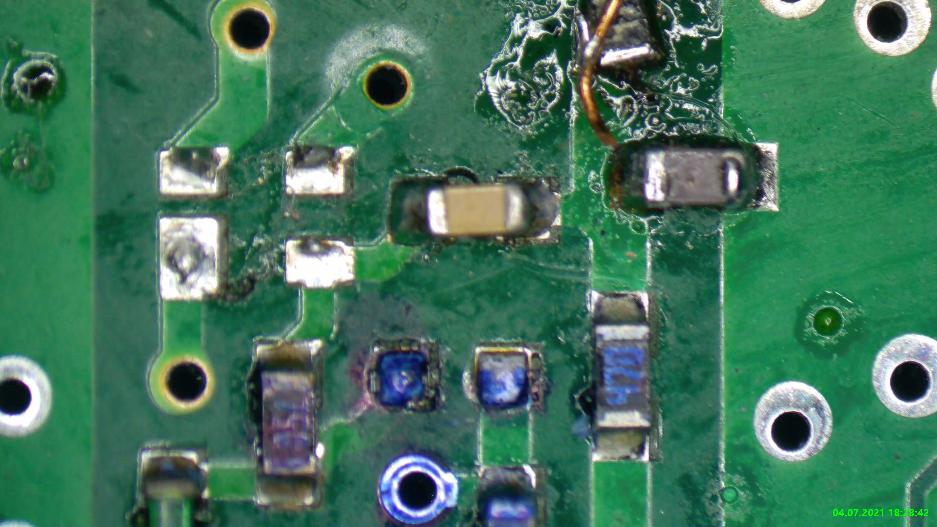 Hallo, hier ein Bild von dem Platz, wo er gesessen hat. Den geflickten Widerstand ignorieren, den hab ich schon neu bestellt. Versuche noch ein Bild von der ganzen Platine zu machen. Danke schon mal bis hierhin. Gruss