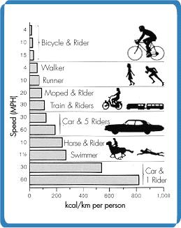 Was hier noch nicht erwähnt wurde (oder ich habe es übersehen), ist die Effizienz des Radfahrens. Mit 100 Kalorien (es gibt vergleichbare Grafiken auch in SI-Einheiten) kommt ein Radfahrer 5 km weit, ein Auto knapp 100 m. https://www.exploratorium.edu/cycling/fahrradfahrens/humanpower1.html Auch ein Fußgänger oder Läufer liegt im Verbrauch nur Faktor 2-3 über dem des Radfahrers. Das zeigt, wie gut die Energieaufnahme des menschlichen Körpers in Bezug auf Nahrungsaufnahme ist. Evolutionär eine weitaus bessere 'Maschine' als alle durch den Menschen erfundenen Maschinen. Die Reaktion mancher Schreiber hier, zeigen mal wieder eine tiefe Ignoranz auf beiden Seiten: "Scheiß-Autos" - "viel Spaß auf dem Rad bei Regen und Schnee". Ist ähnlich bei der Ernährung. Ich persönlich esse seit 40 Jahren kein Fleisch aber das ist mein Ding und ich habe meine Gründe dafür. Das hat für mich nichts mit 'hip' zu tun, ich verurteile keine Menschen die Fleisch essen und ich laufe auch nicht mit einem Schild herum auf dem steht 'Ich bin Vegetarier'. Eine etwas größere Toleranz auf allen Seiten und mehr Gelassenheit täten der Diskussion gut.