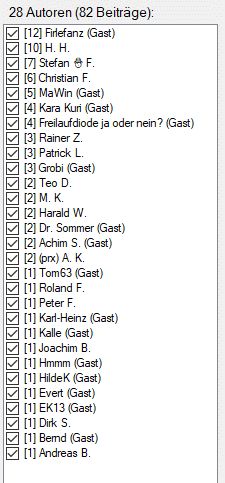 Josef L. schrieb: > Und alle 27 Autoren, die bisher geantwortet haben, sollten mal das > Verhalten des TO "Karl-Heinz (Gast)" interpretieren, der sich seit > seinem Startbeitrag nicht mehr gemeldet hat... Nur um einen vollkommen sinnlosen Post abzusetzen so viel Aufwand? Dass der TO nicht dabei ist haben wir auch ohne dich bemerkt, weil dieses Verhalten keine Seltenheit ist. Dein Aufwand hingegen ist schon etwas merkwürdig. Jetzt stimmt die Liste auch nicht mehr, ich habe wieder einen Beitrag mehr. Jeder einzelne davon ist sinnvoller wie der von dir, so wie auch jeder anderer Beitrag jedes anderen Users. Man, musst Du Langeweile haben. Gibt es auf der Sternwarte nix zu beobachten?
